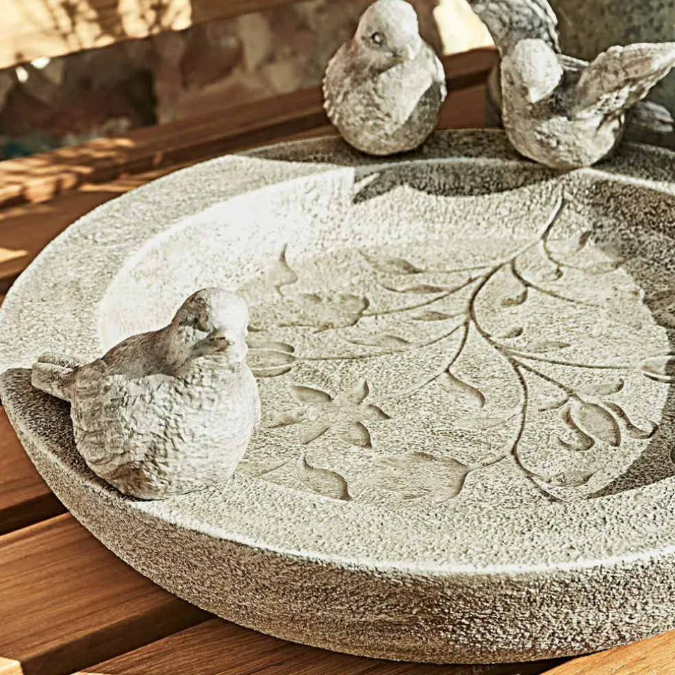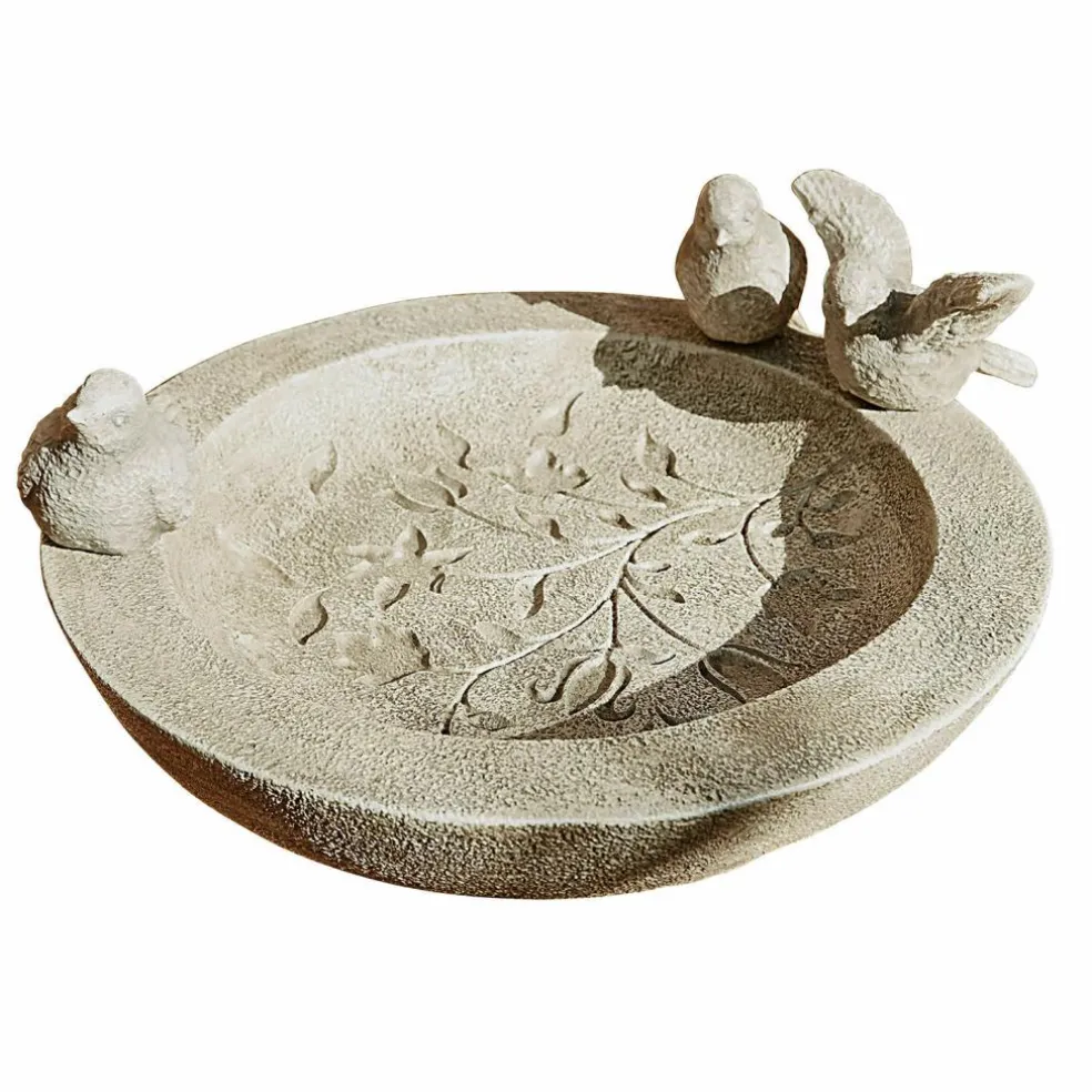 Accessoire de toute beauté orné de feuilles décoratives et d’oiseaux réalisés à la main. Semblable à de la vraie pierre légèrement patinée digne d’un jardin royal. Avec de charmants petits oiseaux sur le rebord. D’élégantes feuilles décoratives soigneusement travaillées à la main et d’adorables petits oiseaux viennent rehausser ce charmant abreuvoir à oiseaux. Faites plaisir à nos amis à plumes autour de votre maison et observez comme ils se réjouissent de cette petite merveille. Bien sûr, vous pouvez aussi l’utiliser à des fins purement décoratives et pratiques dans la maison : par exemple comme coupelle dans le séjour ou pour vos affaires de toilette dans la salle de bains.