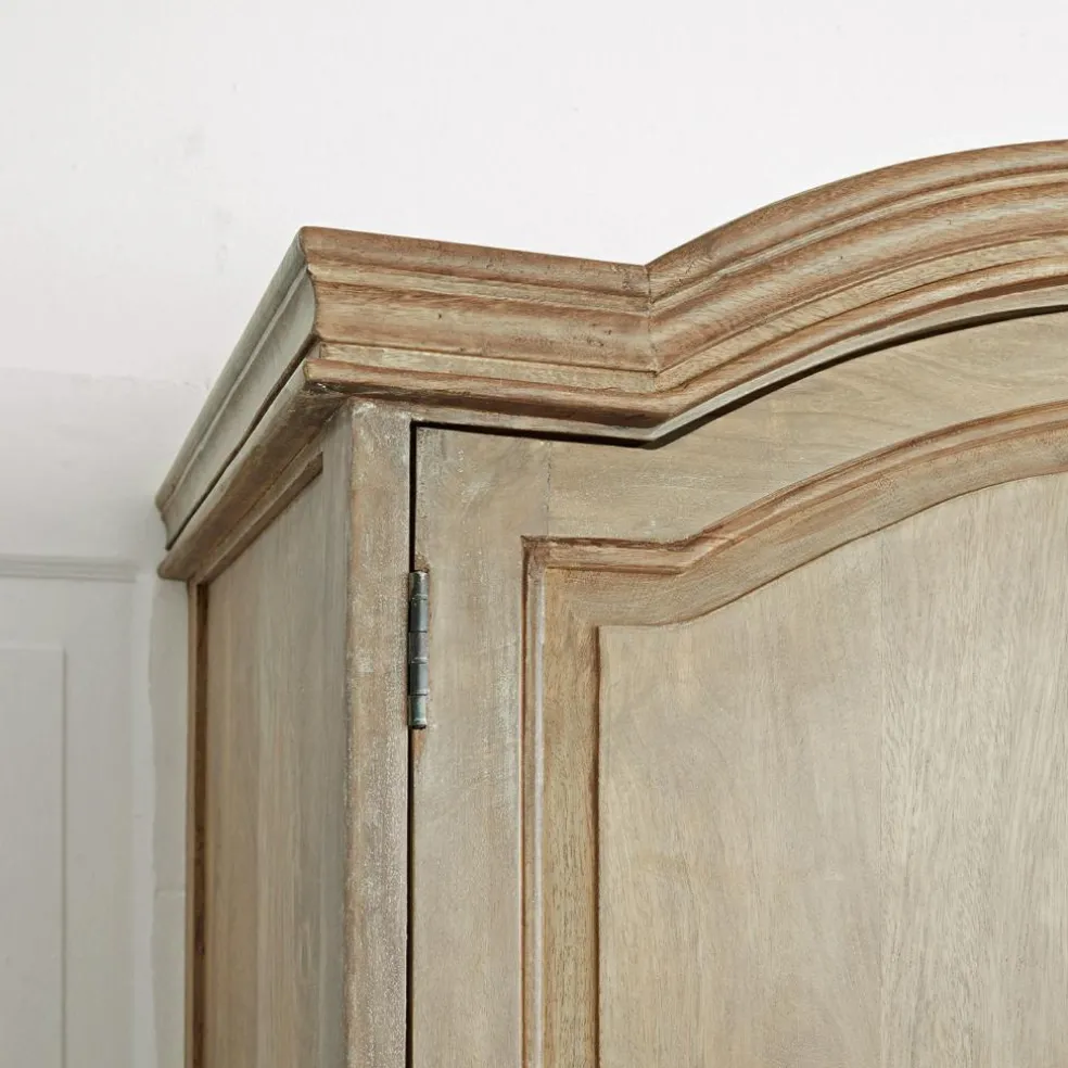 Puis-je vous débarrasser ? Cette simple question montre à quel point nous sommes attachés aux bonnes manières. Et lorsque votre invité verra que vous rangez sa veste, soigneusement accrochée sur un cintre, dans une armoire comme celle-ci, il se sentira d’autant mieux accueilli ! Son regard se posera sûrement sur la corniche superbement ouvragée, puis glissera sur la jolie surface en bois à effet vieilli et sur d’autres détails, pour finalement s’arrêter sur les pieds soigneusement travaillés. Nul doute que ce meuble de qualité ait été conçu par un professionnel du bois qui a le goût du détail ! Une tringle à vêtements se trouve derrière les deux portes à fermeture magnétique de la partie haute de l’armoire. La partie basse possède quant à elle deux grands tiroirs, dans lesquels vous pourrez ranger des écharpes, bonnets et gants, mais aussi la laisse du chien, des sacs de courses ou tout autre accessoire que vous souhaitez garder à portée de main. Vous pourrez aussi utiliser l’un des deux tiroirs pour ranger les pantoufles de la famille ou de vos invités. Pour compléter le style authentique de cette armoire, les portes sont habillées de poignées rondes, tandis que les tiroirs possèdent des anneaux classiques.