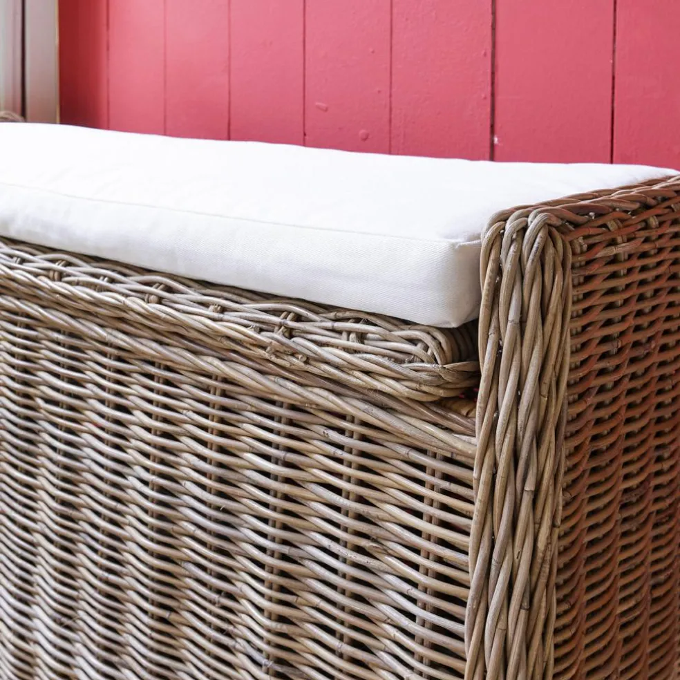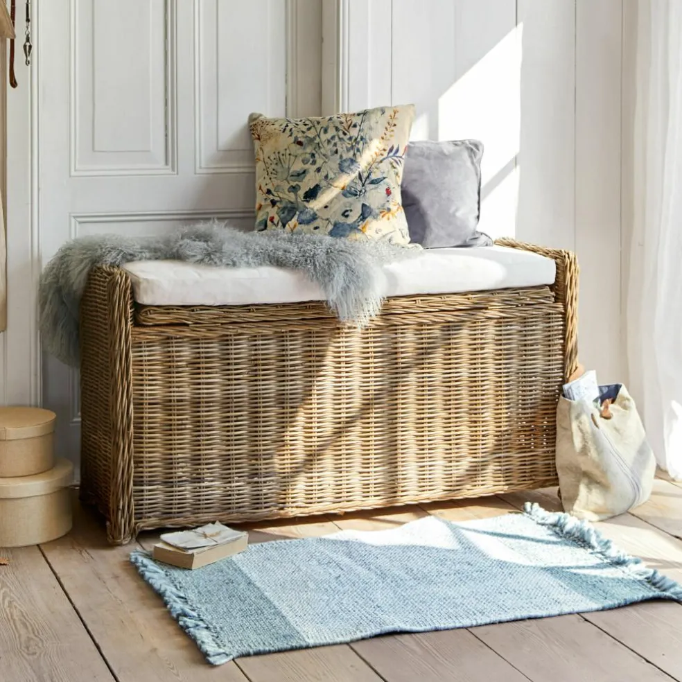 En rotin tressé à la main autour d’un bâti solide en acajou. Coussin d’assise moelleux fourni. Sous la surface d’assise se cache un bel espace de rangement. Un objet luxueux et naturel dans un format pratique. Ce superbe banc constitue un complément idéal pour n’importe quelle pièce. Impossible de vous tromper! Il permet en outre de dissimuler quantité d’affaires. Que ce soit les jouets des enfants, les laisses des chiens, des coussins, du linge de lit ou d’autres accessoires : tout est toujours bien rangé dans ce coffre. Classique, intemporel et durable, ce meuble convient dans tous les intérieurs et vous apportera longtemps satisfaction. Il est aussi très joli près d’une fenêtre, d’où vous pourrez profiter de la vue tout en étant confortablement installé.