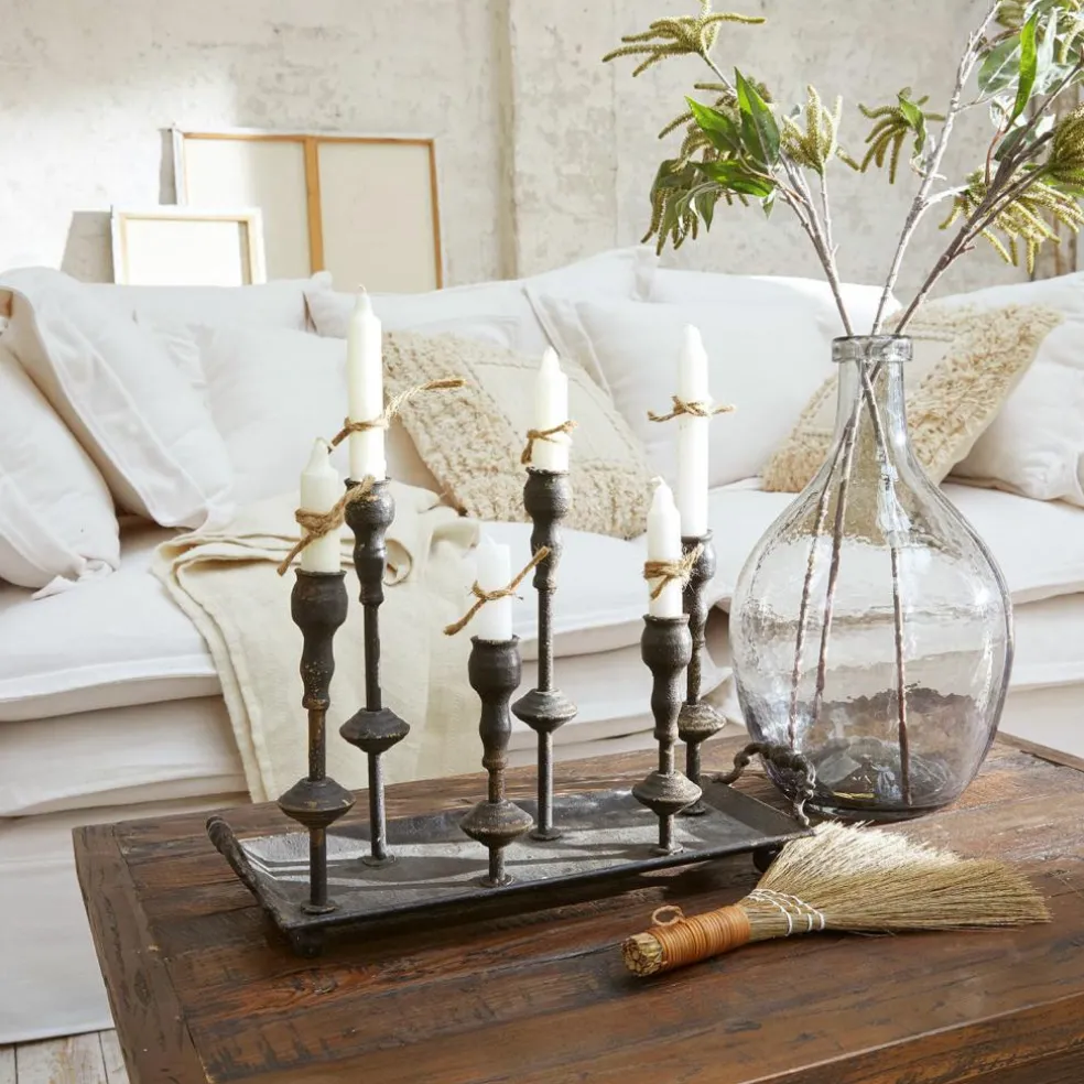 Ce plateau-bougeoir en fer semble avoir été trouvé dans un vieux grenier. Il doit son aspect vintage authentique à une finition shabby appliquée avec soin, à l’origine des traces artificielles d’usure. Six bougeoirs décorent le plateau et leurs hauteurs différentes soulignent le charme unique de cette belle pièce. Notre conseil : garnissez le plateau de décorations saisonnières ! Par exemple, des boules de Noël pendant les fêtes, des fleurs de printemps, des œufs de Pâques, des fleurs d’automne, etc. Grâce à deux poignées, vous pouvez transporter facilement et confortablement le plateau d’un endroit à l’autre. Vous donnerez ainsi à chaque pièce une atmosphère particulièrement romantique en un clin d’œil.