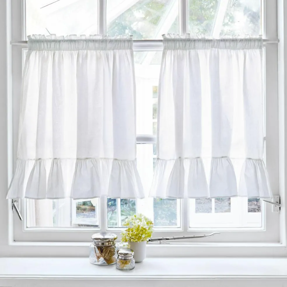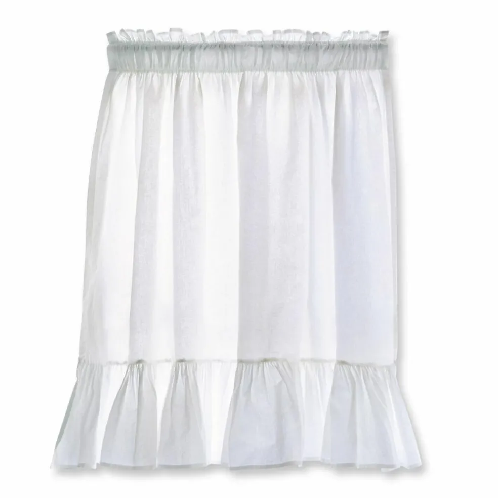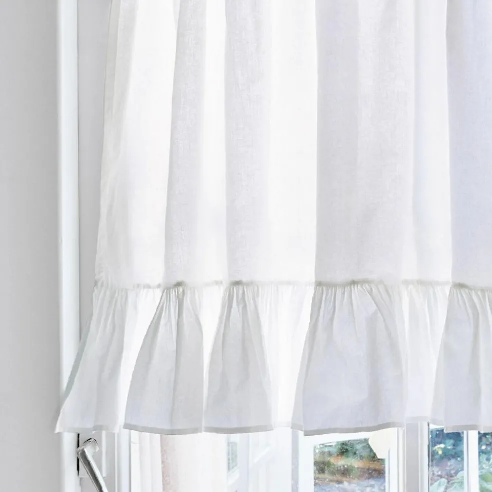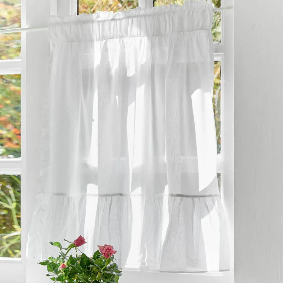 Si vous aimez les intérieurs romantiques, vous devriez inclure ce brise-bise dans la décoration de votre pièce. Il attire joliment le regard et confère à votre fenêtre une expression unique en toute délicatesse. Des volants fantaisie sur les bords supérieur et inférieur apportent une touche décorative. Le tissu naturel en pur coton est doux, fluide et suffisamment fin pour laisser passer la lumière du jour avec une douceur agréable. Ainsi, la pièce conserve sa luminosité et vos plantes ou objets décoratifs uniques sur le rebord de la fenêtre disposent de suffisamment d’espace pour être sur le devant de la scène de manière efficace. Grâce à la base en tunnel, le textile est très facile à disposer sur la tringle à rideau et s’installe à la hauteur souhaitée sur la fenêtre. Un accent décoratif plein d’ambiance pour une cuisine ou une salle de bains de rêve.