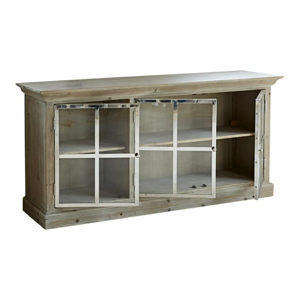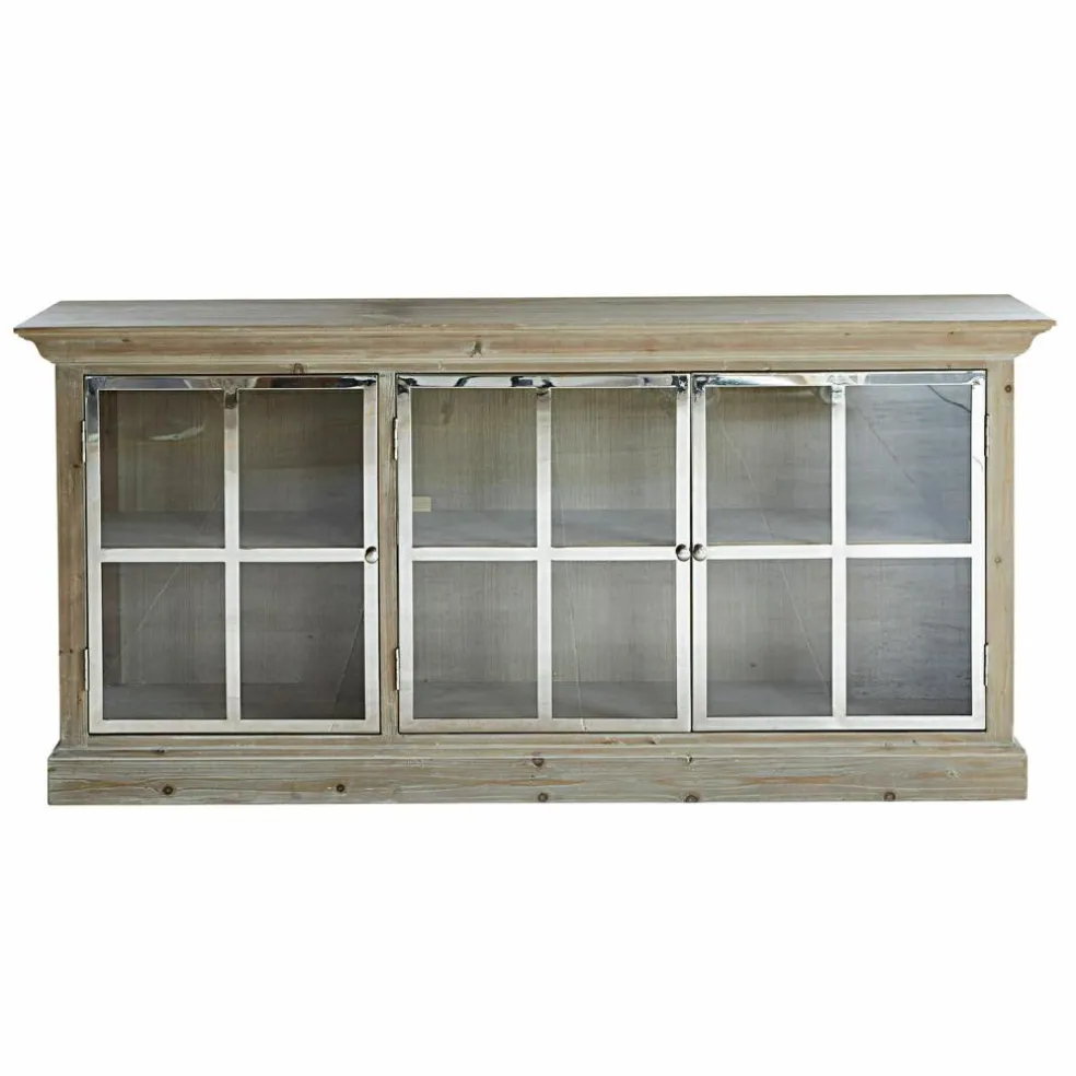 Un classique du style maison de campagne dans un mélange de matériaux intéressant. Avec trois élégantes portes à croisillons encadrées d’inox très brillant. Grand espace de rangement intérieur avec deux tablettes amovibles. Un classique intemporel réinterprété : ce superbe buffet met à l’honneur un bois de sapin soigneusement retravaillé. Rehaussé d’une finition sobre des surfaces, le joli veinage de la matière naturelle est idéalement mis en valeur. Les portes vitrées en inox brillant forment un très beau contraste par rapport au caisson en bois massif. Des tablettes amovibles à l’intérieur permettent de ranger tout un tas de choses. Un superbe meuble dans le style maison de campagne classique, confectionné artisanalement et d’excellente qualité.