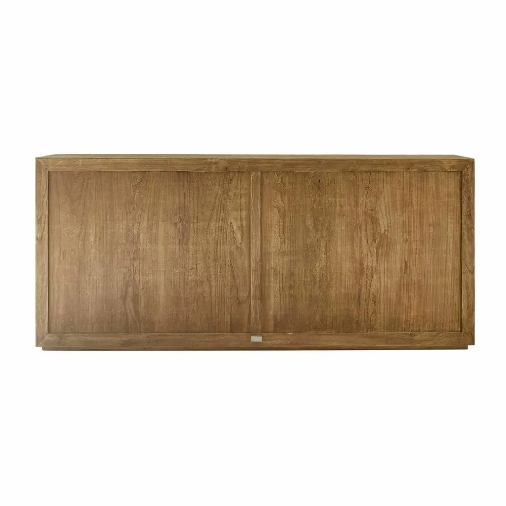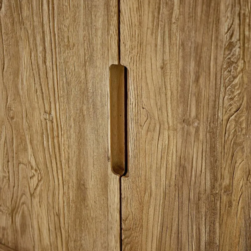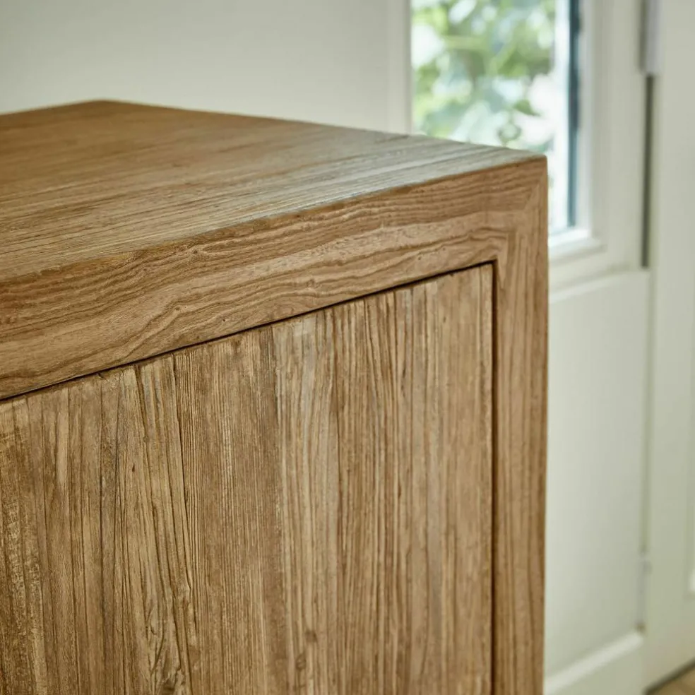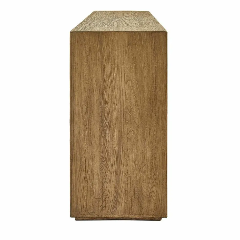 Clair dans sa forme, puissant dans son effet, ce buffet bas séduit par son style rustique qui mise sur l’authenticité. Fabriqué à partir de bois d’orme récupéré, il se distingue par son veinage, ses légères fissures et ses irrégularités naturelles qui lui confèrent un caractère unique. La surface reliéfée rappelle le bois usé par les intempéries dans les vieux ateliers ou les granges: délibérément imparfait, et c’est précisément pour cela qu’il est si charmant. Les trois larges portes coulissantes s’intègrent parfaitement dans sa forme compacte et font de la commode un compagnon fonctionnel et élégant à la fois. Que ce soit dans la salle à manger, l’entrée ou le salon, cette pièce est un vrai meuble de caractère.