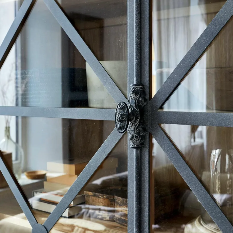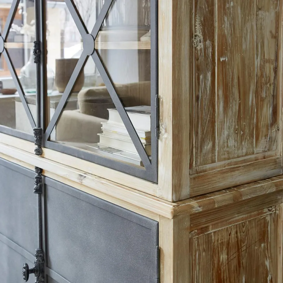 Lorsque le look maison de campagne classique flirte avec l’esprit industriel. Buffet réalisé avec soin à partir de bois de sapin revalorisé, éléments rustiques en métal et verre fin. Le veinage naturel du bois est souligné d’une finition blanchie. Depuis des années, les connaisseurs en matière de meuble observent avec intérêt à quel point le style maison de campagne classique est ouvert à de nouveaux courants. La variante élégante à la française se marie notamment très bien avec le style cottage rustique, et s’harmonise même avec le style industriel, qui peut parfois paraitre un peu froid, pour un effet des plus conviviaux. Le résultat : des meubles d’une forte personnalité tels que ce buffet qui ne manquera pas d’attirer l’attention, que vous habitiez à la campagne ou en ville, dans un appartement ou un loft. Et si le style maison de campagne séduit par sa flexibilité, il n’en demeure pas moins intransigeant au regard de la qualité de ses matériaux et du soin apporté à sa fabrication. C’est pourquoi ce buffet a été conçu à la main avec minutie et à partir de bois de sapin revalorisé, de métal et de verre. L’artisan en charge de la création de ce meuble a indéniablement fait montre d’un grand savoir-faire dans le travail de ces trois matériaux. Les vitrages aux croisillons métalliques ont dû être soigneusement intégrés dans les portes tandis que la partie inférieure a été entièrement réalisée en métal. Une des particularités de ce buffet est son mécanisme de fermeture ouvert, un héritage du style industriel tendance.