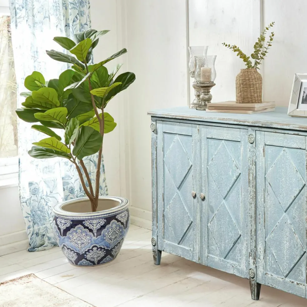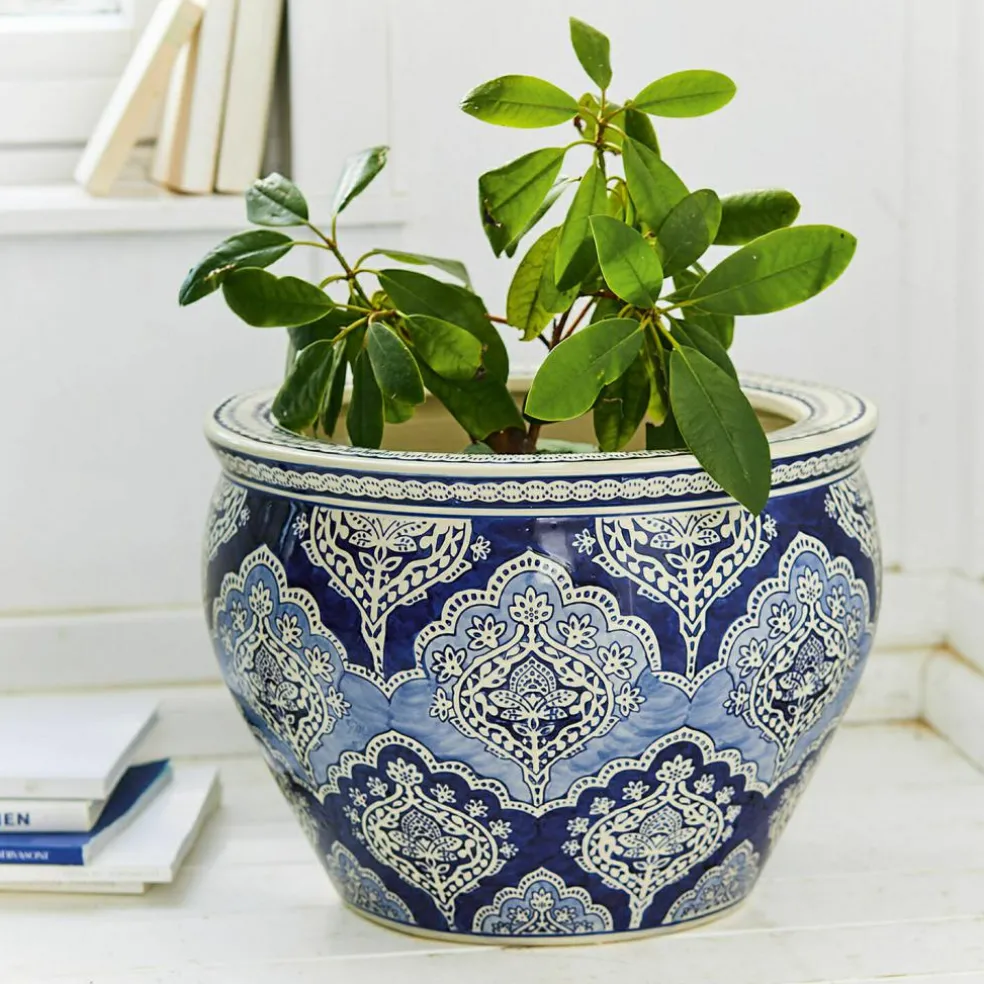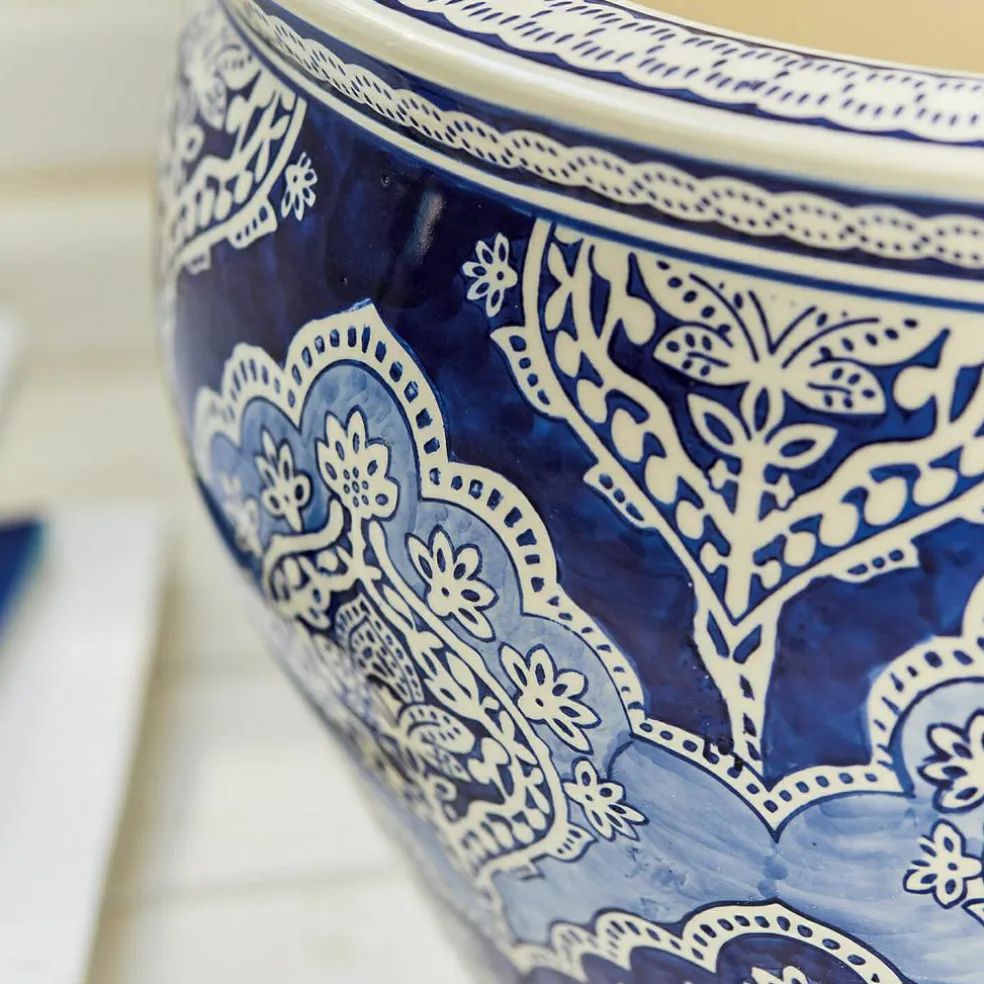 Un classique intemporel au charme champêtre. Chaque pièce est en porcelaine peinte à la main et unique. Ne résiste pas au gel. Une merveilleuse pièce en artisanat d’art. Un superbe écrin pour vos fleurs, peint avec soin à la main : ce cache-pot en porcelaine forme un point de mire irrésistible. L’émaillage de la surface assure un look vieilli et rend l’objet plus résistant. Sur la terrasse ou le patio, il mettra joliment en scène vos fleurs d’été ou vos élégantes plantes vertes. L’hiver venu, il formera un très bel élément de décoration en intérieur. Ce modèle ne présente pas de trou de drainage.