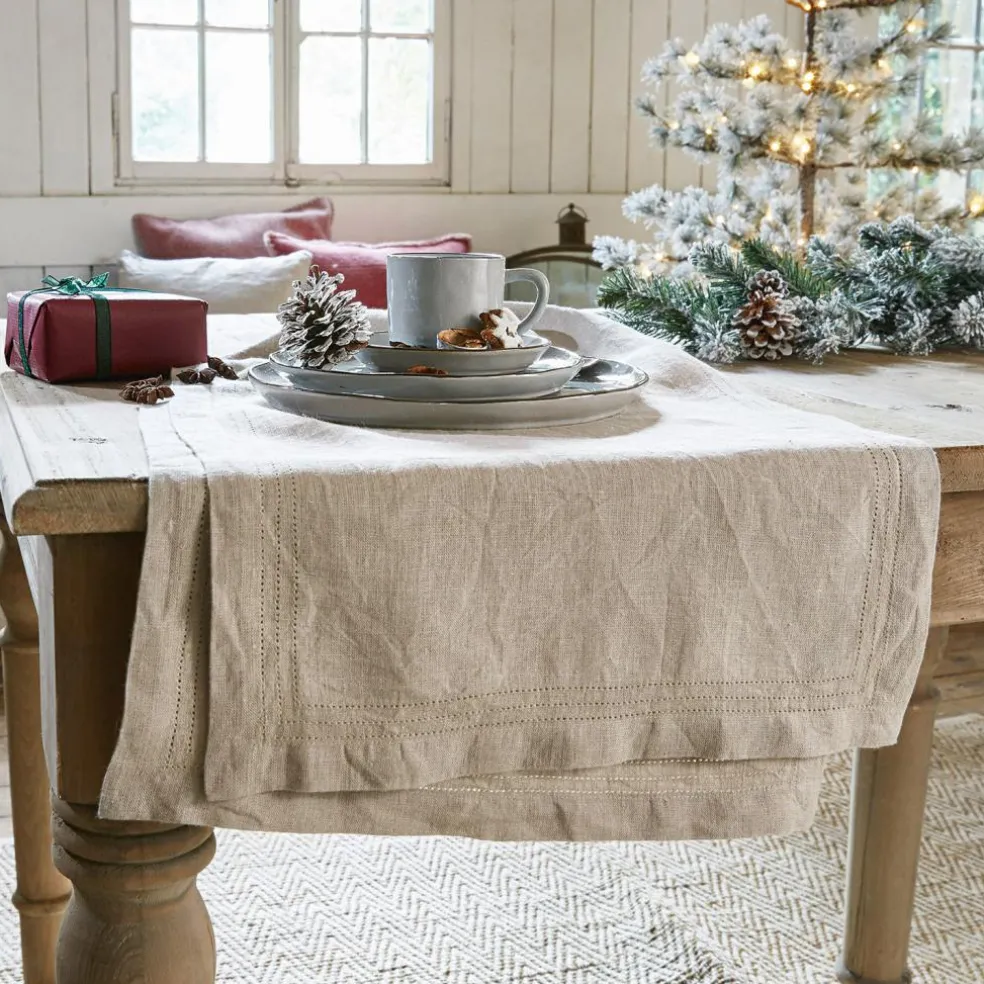 Tissu en pur lin. Bordure décorative finement ajourée. Son élégance sobre mettra votre table en valeur. Ce beau chemin de table en 100 % lin naturel est très facile d’entretien. Cette petite merveille au style intemporel, ornée d’une bordure finement ajourée, ajoutera une touche de raffinement à votre table joliment dressée. L’aspect authentique de la matière naturelle s’accorde avec les concepts d’ameublement les plus divers, pour une belle harmonie des styles classique et contemporain.