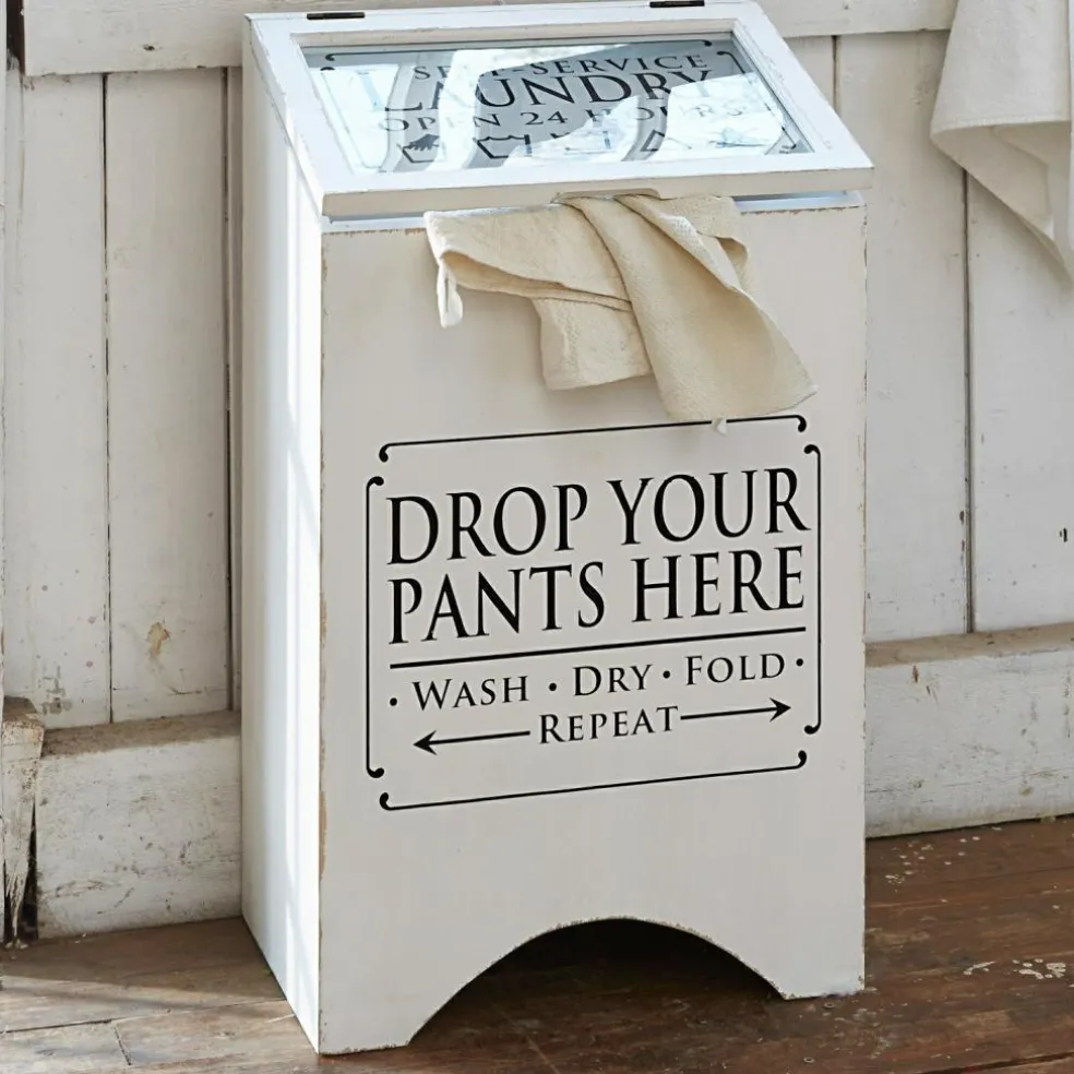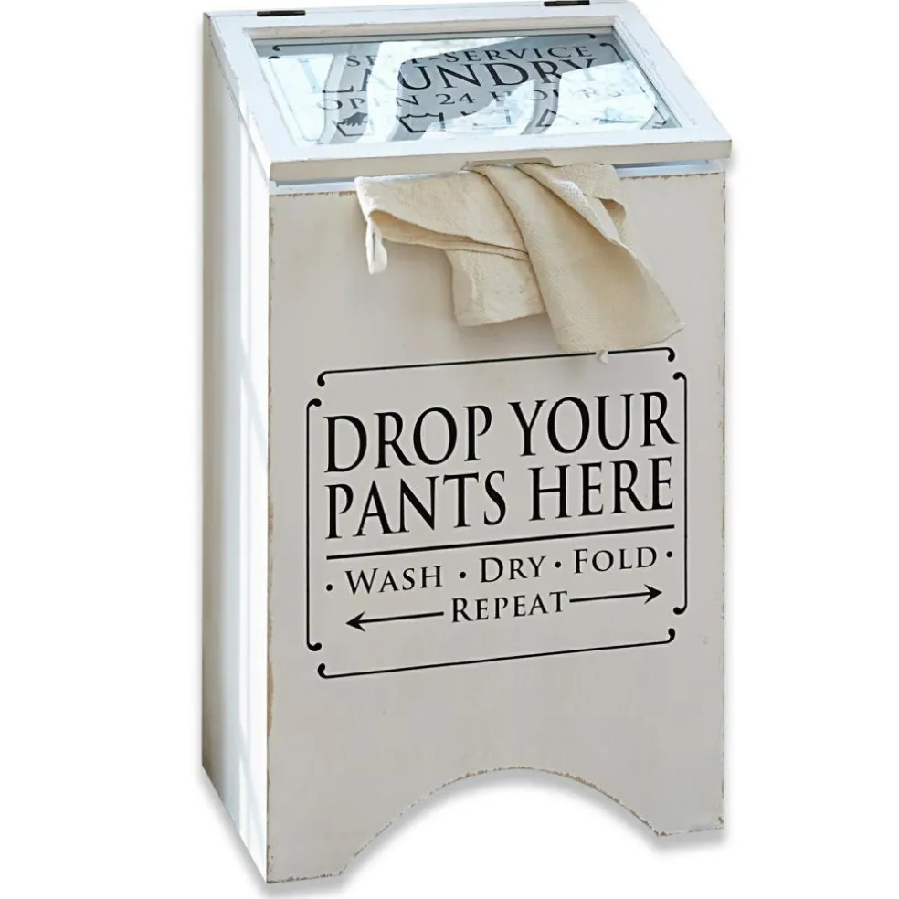 Belle finition ancienne et inscription humoristique. Couvercle rabattable en verre avec inscription imprimée. « Laissez tomber vos pantalons ici » Cette amusante inscription imprimée vous mettra de bonne humeur au moment d’accomplir la corvée de lessive. Un accessoire aussi pratique qu’esthétique ! Dans ce coffre, votre linge sale sera élégamment rangé de manière hygiénique jusqu’à la prochaine lessive. Ce beau coffre de style campagne classique, revêtu d’un fini vieilli et d’une inscription vintage, est un meuble très original au charme rétro. Autrefois, il n’était pas courant de posséder une machine à laver. On lavait donc le linge dans une laverie, et l’on en profitait pour discuter un peu. Le design esthétique nous rappelle cette époque révolue. Ce joli meuble est en bois de pin et le dos est composé d’un panneau en fibres de densité moyenne. Le couvercle imprimé est en verre. Il arbore des symboles imprimés qui rappellent les laveries ou les buanderies d’autrefois. Naturellement, ce coffre pourra aussi servir à ranger d’autres choses, comme des serviettes de toilettes utilisées dans la salle de bain, par exemple. Voici comment laver le linge devient un plaisir.