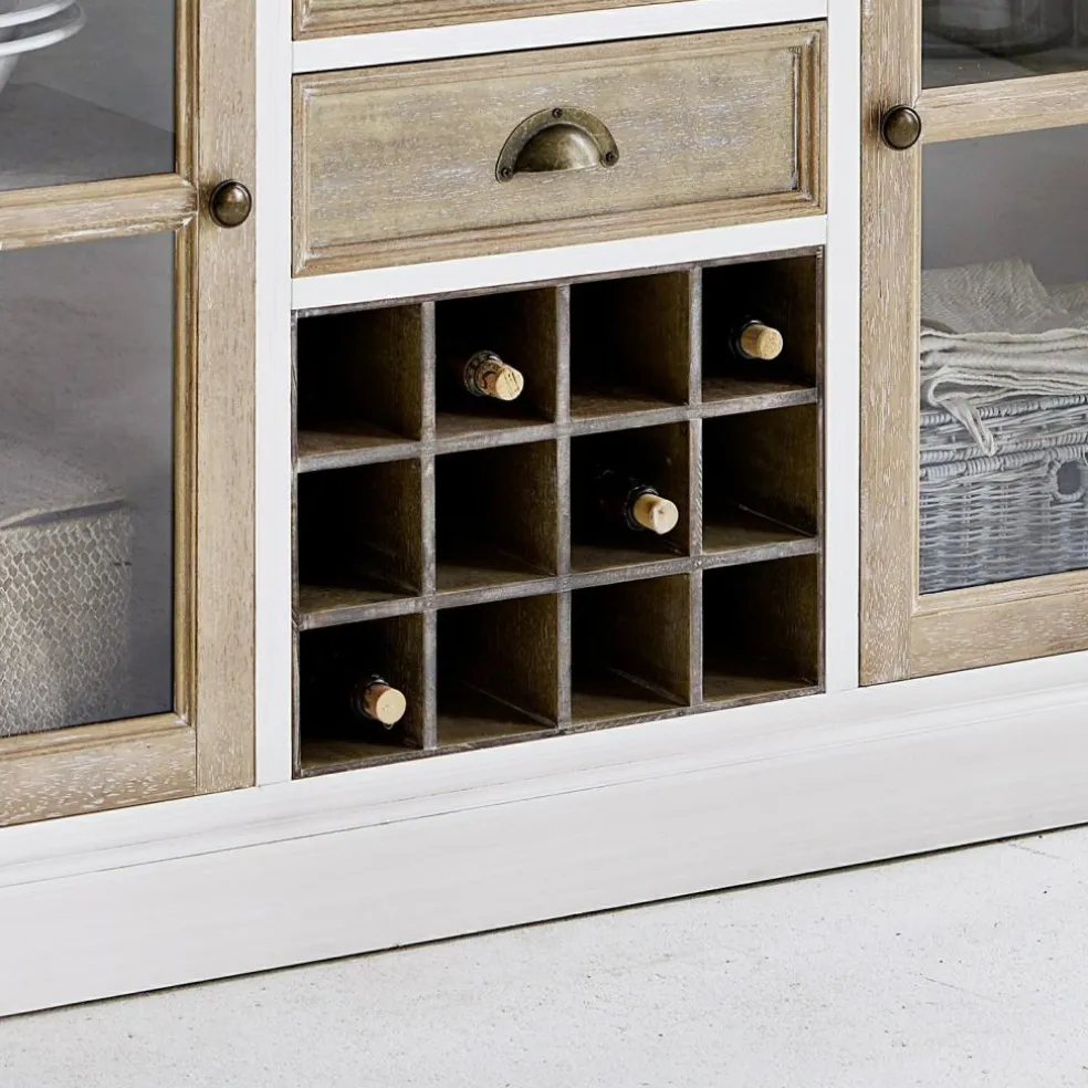 La symbiose parfaite de deux couleurs confère à cette commode un charme séduisant au style traditionnel classique. L’étagère offre un espace de rangement suffisant pour vos bouteilles de vin préférées. Le porte-bouteilles au centre de la commode permet de ranger jusqu’à 12 bouteilles. Vous pourrez placer les verres à vin dans les deux compartiments sur les côtés. Les trois tiroirs offrent un espace de rangement supplémentaire. Ils sont pourvus de poignées en métal charmantes au style nostalgique. Les deux portes sont dotées de fenêtres à croisillons. Ce modèle impressionne avant tout par le contraste du bois foncé et cérusé blanc. Un concept chromatique repris à l’intérieur du meuble, séduisant dans un charmant coloris blanc vieilli.