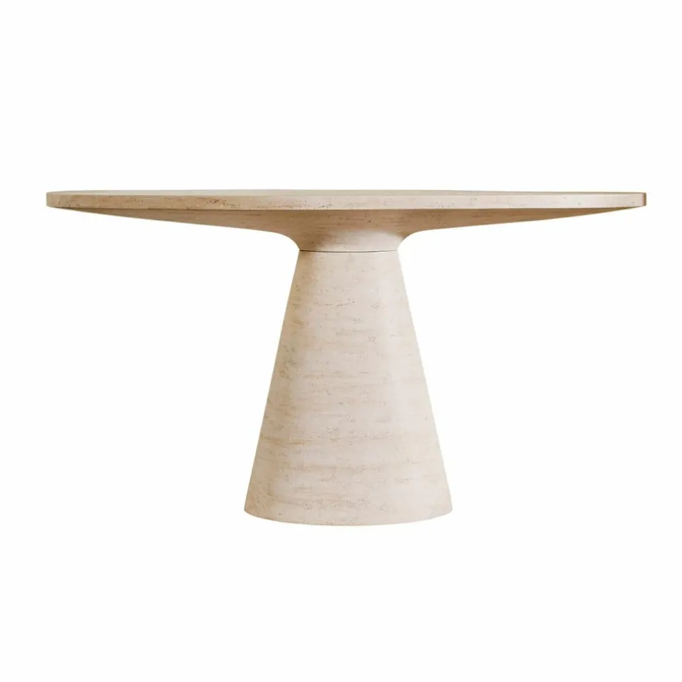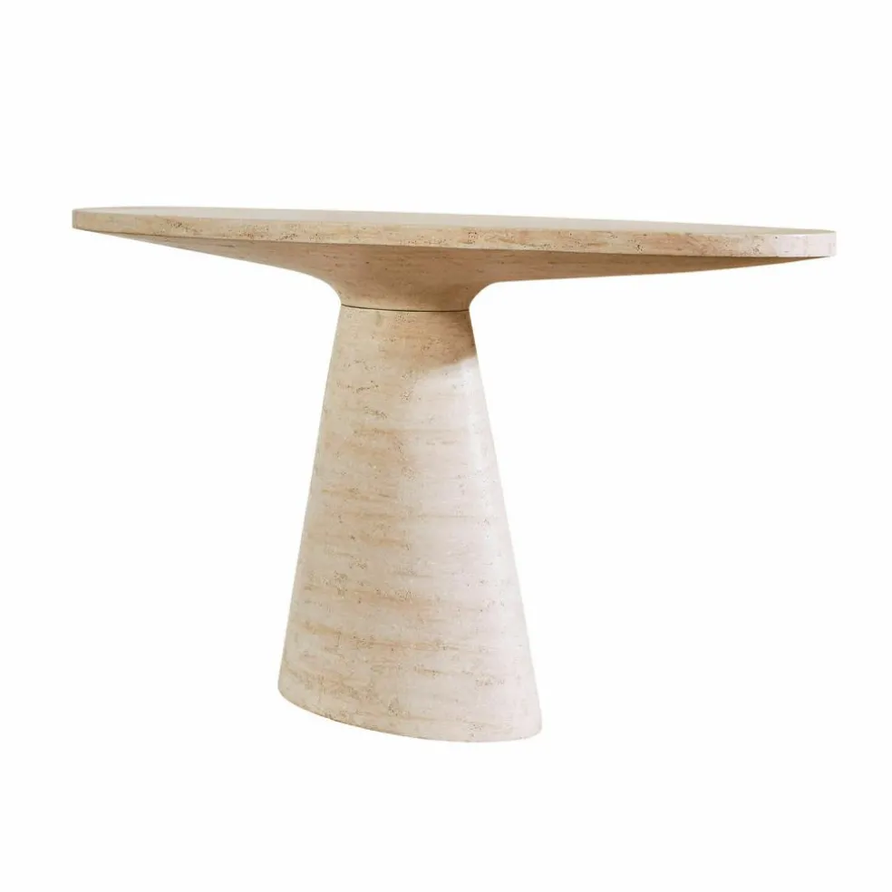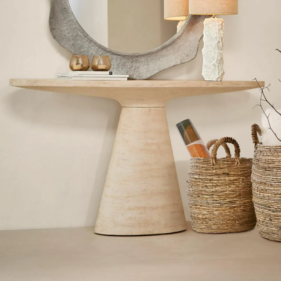 Un meuble d’exception: cette console n’enthousiasme pas par ses fioritures, mais par sa beauté simple, son toucher naturel et sa forme qui reste en mémoire. Le travertin revalorisé raconte le temps qui passe… Il présente de fines inclusions, des pores délicats et un jeu de couleurs entre le beige chaud et la pierre naturelle terreuse. Avec son plateau de table ovale qui repose sur un socle conique, le meuble ne manque pas de caractère. La fluidité des lignes donne l’impression que la console est d’un seul tenant. Que ce soit dans l’entrée, en solitaire dans le salon ou comme piédestal pour de beaux objets, elle apporte calme, clarté et luxe naturel dans chaque pièce.
