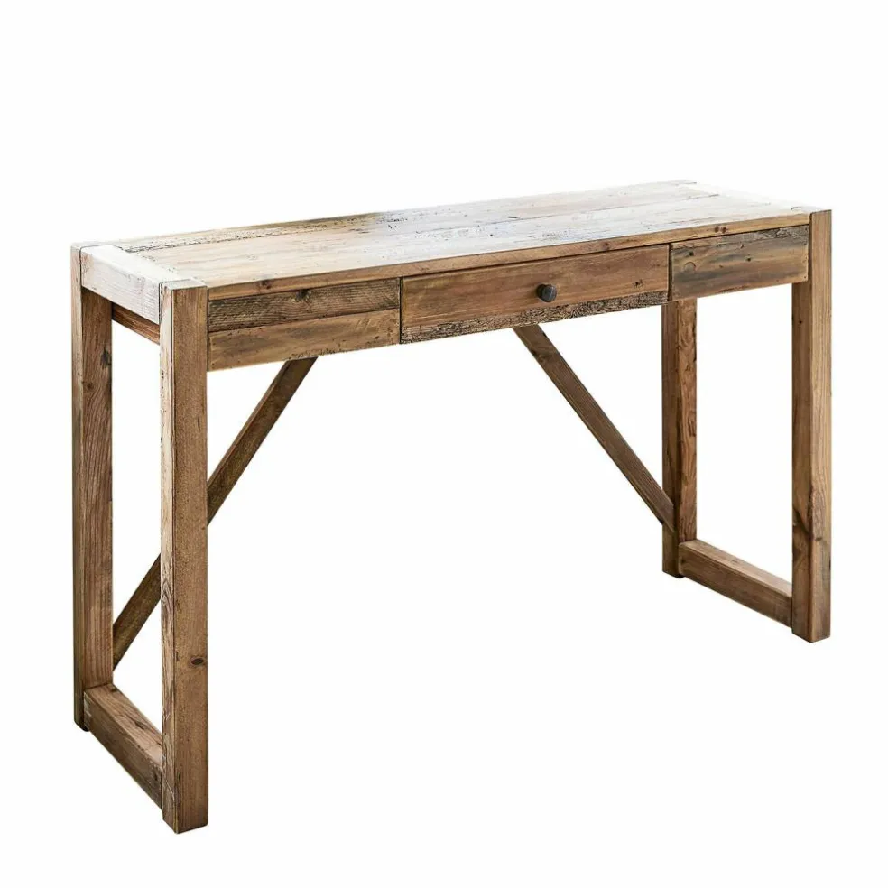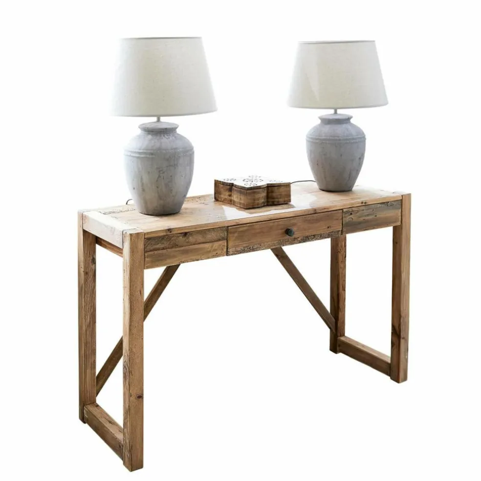 Cette console pourrait bien devenir votre nouveau meuble préféré ! Ce modèle accorde une élégance classique avec un charme champêtre, en plus de marquer des points de par sa matière durable. Son bois de pin massif a été soigneusement revalorisé pour remettre en valeur la structure caractéristique du matériau naturel. Les traces de son vieillissement ont été volontairement conservées pour rendre ce meuble encore plus charmant. Le tiroir intégré au centre ajoute encore au côté pratique de cette console. Une pièce pleine de caractère qui enrichira tous les intérieurs. Son aspect sobre et simple donne au meuble une impression de légèreté qui lui permet de s’intégrer à votre pièce, que ce soit l’entrée, le salon ou encore la chambre à coucher.
