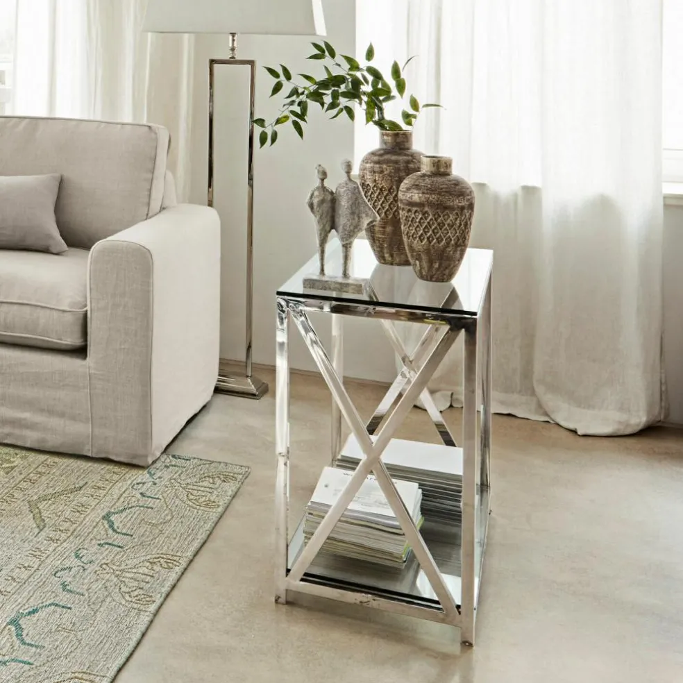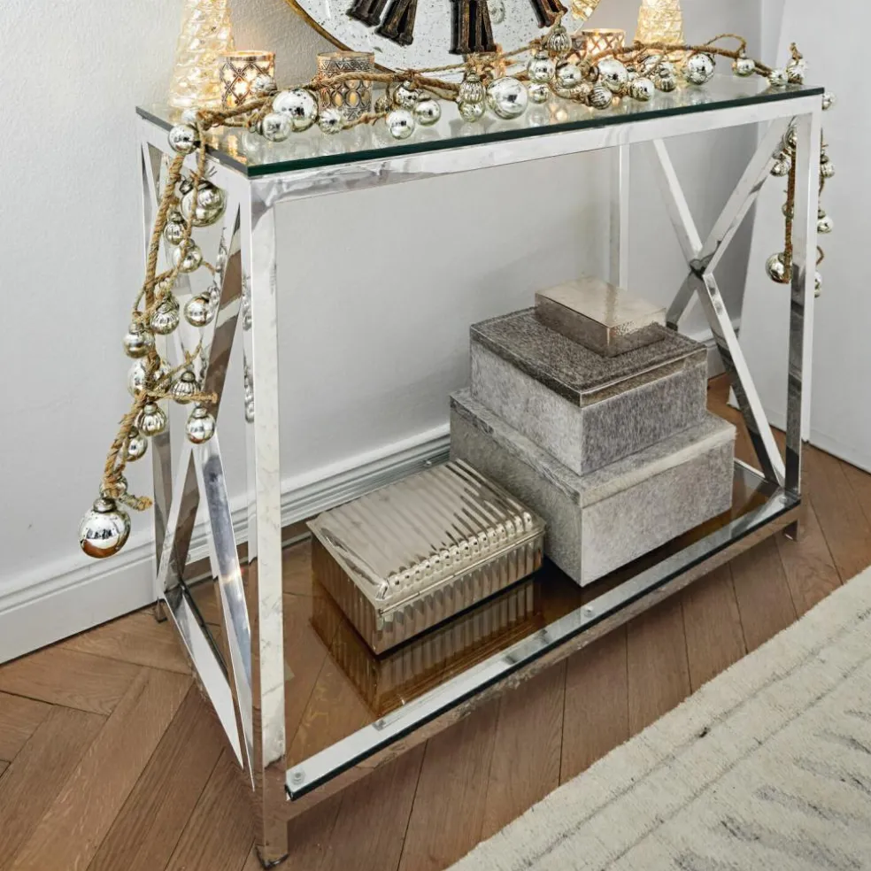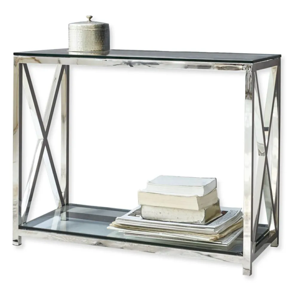 Cette console vous surprendra par son style épuré à la fois classique et moderne, ses matériaux haut de gamme et son excellente fabrications. La structure brillante en inox élégant porte les deux plateaux en verre avec légèreté. Les deux croisillons assurent la stabilité avec style. La faible profondeur de ce meuble permet de l’installer merveilleusement dans les pièces étroites ou de petites dimensions, par exemple dans l’entrée.