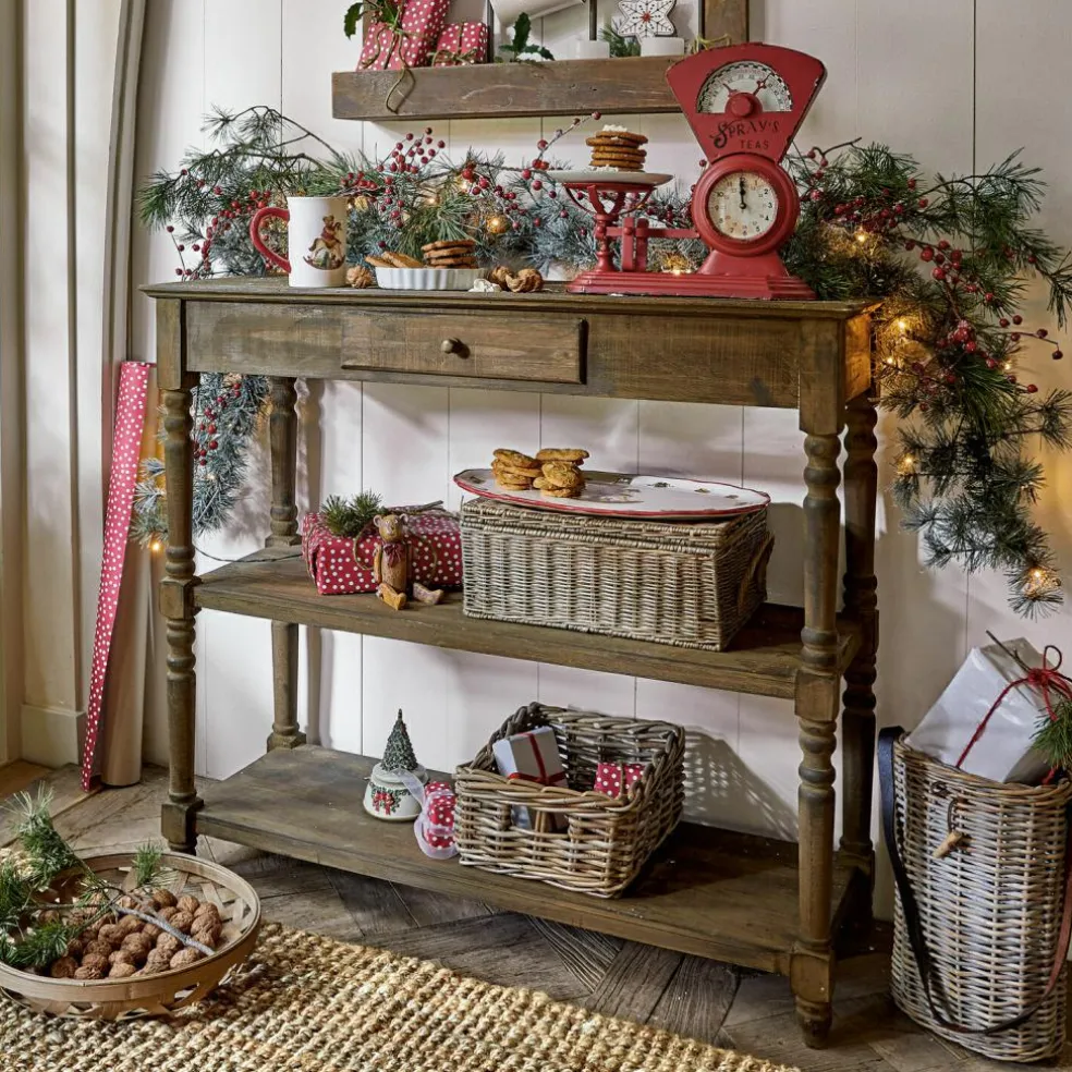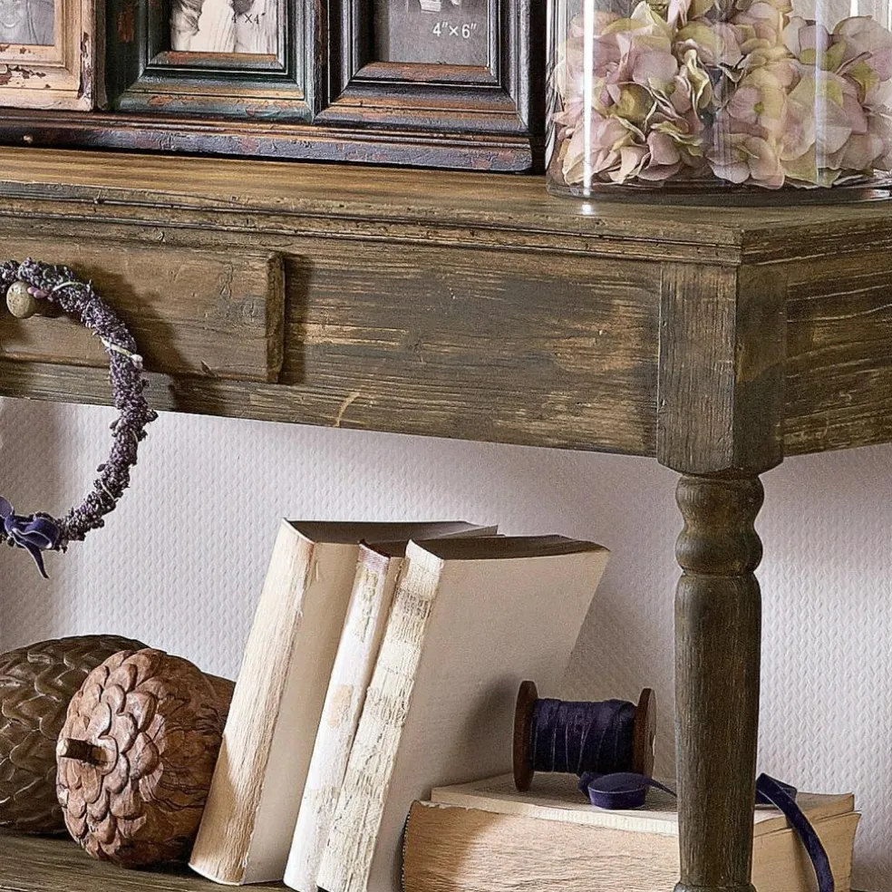 Cette console étroite en sapin trouvera toujours une petite place ! La lasure vintage et les adorables pieds tournés lui donnent une allure de meuble d’époque qui rendra n’importe quelle pièce accueillante. Dans le salon elle pourra accueillir deux jolies lampes, présenter des serviettes dans la salle de bains grâce à ses deux tablettes ou de la vaisselle dans la cuisine, et vous pourrez ranger de menus objets dans le tiroir.