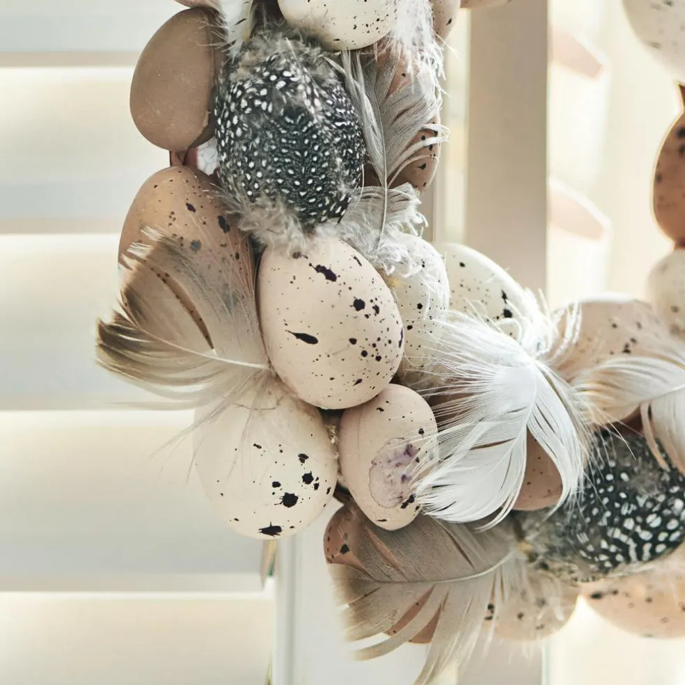 Cette jolie couronne de Pâques associe des plumes naturelles et des répliques d’œufs en trompe l’œil de grande qualité. Avec leurs taches de différentes couleurs, les œufs rappellent de petites friandises sucrées. Les plumes sont réparties tout autour de cette superbe couronne de Pâques. Confectionné à la main, ce petit bijou apporte la touche de décoration parfaite pour une porte, un mur ou des fenêtres au printemps. Plutôt que d’être peints avec des couleurs vives, les œufs évoquent un aspect naturel. La couronne adopte ainsi une allure discrète et élégante qui s’intègre parfaitement aux décorations de Pâques existantes sans leur voler la vedette.