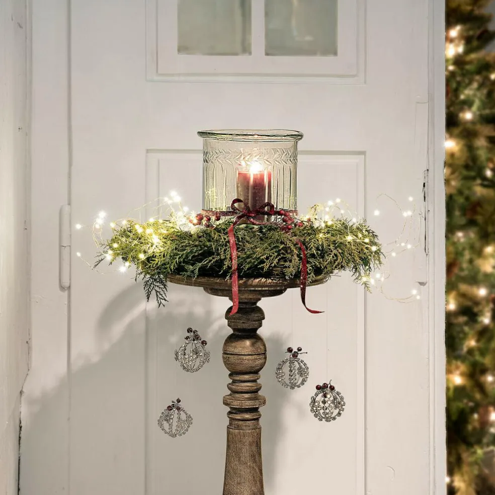 Comme une balade dans une forêt endormie, cette couronne mêle délicatement les éléments du sous-bois à l’art de la composition. Les branches de pin séchées, longues et effilées, semblent figées par le givre. Elles s’enroulent autour d’une base en rotin brut, qui leur offre à la fois structure et chaleur. Entre leurs lignes, de petites capsules rondes de schima se nichent comme des trésors botaniques oubliés, ponctuant l’ensemble d’un charme discret. L’irrégularité naturelle des matériaux, la douceur des tons boisés et la légèreté de l’ensemble en font une pièce à la fois sauvage et élégante. Qu’elle orne une porte, une table ou un mur, cette couronne apporte une note de sérénité silencieuse, un hommage à la beauté de l’éphémère, à l’équilibre fragile entre nature et poésie du quotidien.