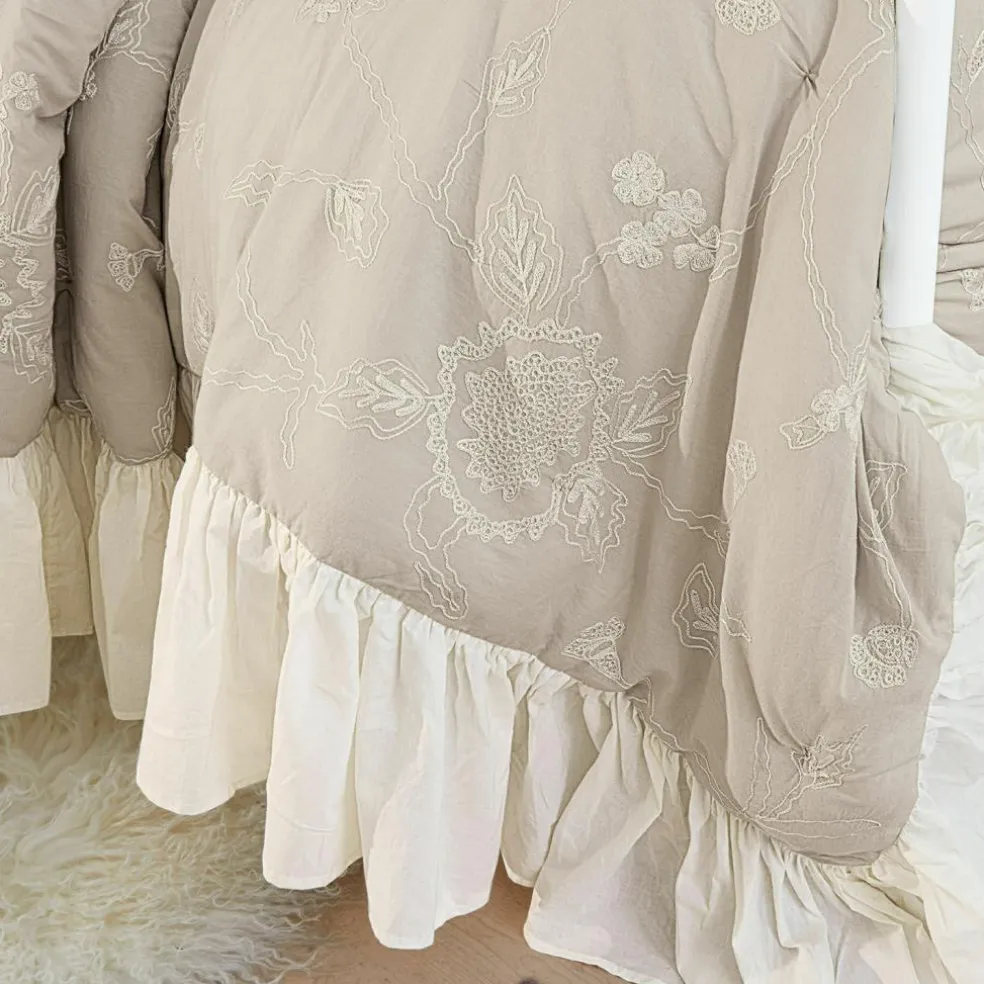 Une touche de romantisme pour une chambre à coucher vintage. Ouvragée avec trois couches de tissu. Avec de superbes broderies et une bordure volantée. Douce, fluide et élégante : cette belle courtepointe en coton a tout pour plaire et offre tout le confort nécessaire pour de bons moments de détente et de bien-être. Sa confection trois couches de tissu est typique : l’avant est orné de jolies broderies fleuries tandis que l’arrière est plus sobre. La couche intermédiaire au garnissage souple lui confère plus de volume. L’origine bordure volantée vient couronner le tout. Offrez une ambiance luxueuse et romantique à votre chambre à coucher vintage. Utilisée comme couvre-lit, cette courtepointe sera certaine de produire son petit effet.