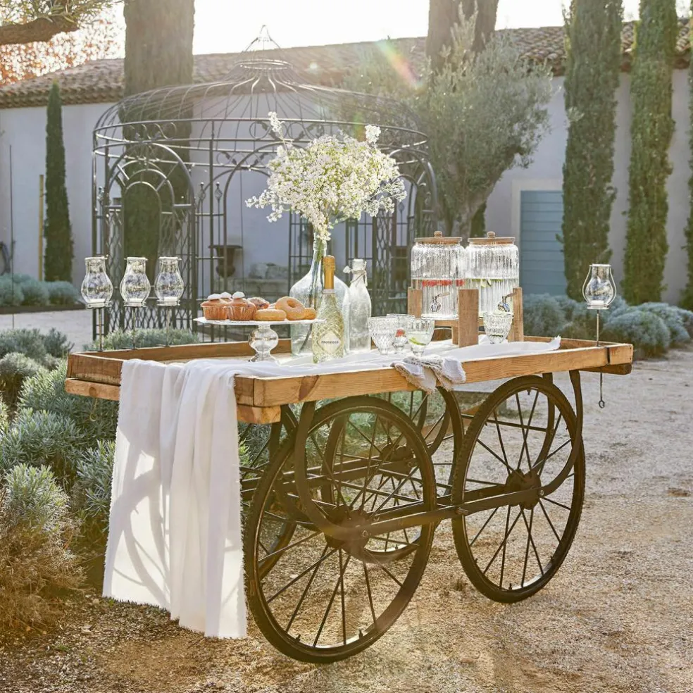 Cette desserte laissera vos convives sans voix ! Elle ressemble à l’œuvre d’un artiste moderne, qui se plaît à déambuler dans les marchés aux puces ou dans les halls d’usine désaffectés, pour ensuite se rendre dans son atelier et assembler ses trouvailles les plus diverses avec beaucoup de dextérité et de créativité. Cette desserte originale a sûrement été fabriquée ainsi. Sa force de caractère fera sensation dans de nombreux intérieurs. Son plateau en bois rustique semble avoir déjà vécu , en effet, celui-ci a été recyclé, de sorte que chaque plateau est unique. Cependant, l’élément le plus surprenant de cette desserte est son cadre en forme de roues en métal vieilli, comme celles utilisées autrefois dans l’industrie, et qui lui offrent un rendu des plus séduisants. Avec cette desserte originale, vous pourrez afficher en toute liberté votre passion pour le style créatif.