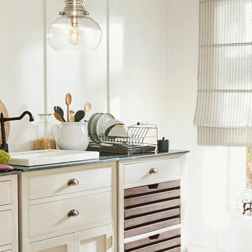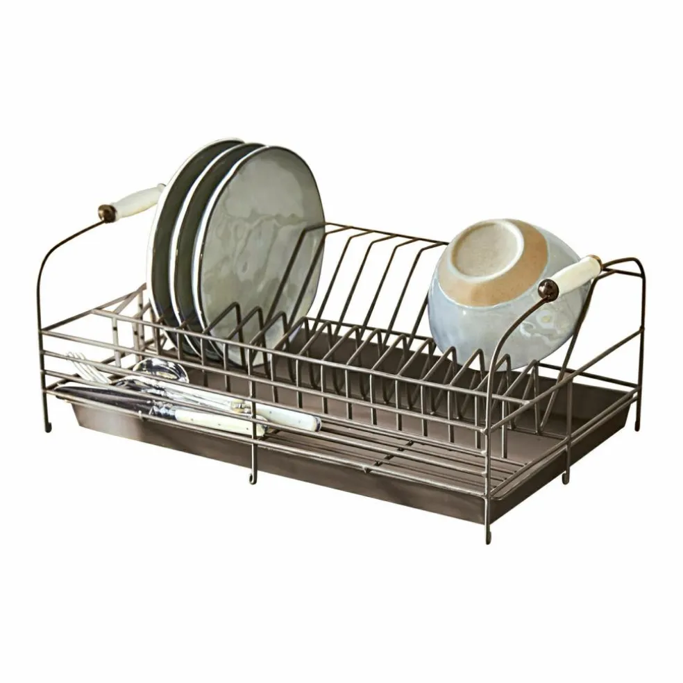 Style vintage en métal. Et voilà que le ménage devient une jolie activité. Avec un plateau d’égouttage pratique. L’eau coule directement dedans. Ce joli égouttoir à vaisselle nous replonge dans les moments heureux dans la maison de nos grands-mères. Ce modèle de style vintage n’est pas seulement pratique pour faire sécher la vaisselle mais il en profite aussi pour décorer joliment la cuisine. Il se marie idéalement avec le style shabby chic. Nul besoin du lave-vaisselle si vous n’avez que quelques petites choses à laver. C’est meilleur pour l’environnement et ça nous rappelle le bon vieux temps. Et pourquoi pas se servir de ce bel accessoire comme d’un objet de décoration en y présentant par exemple de belles assiettes que vous aurez chinées dans une brocante ?