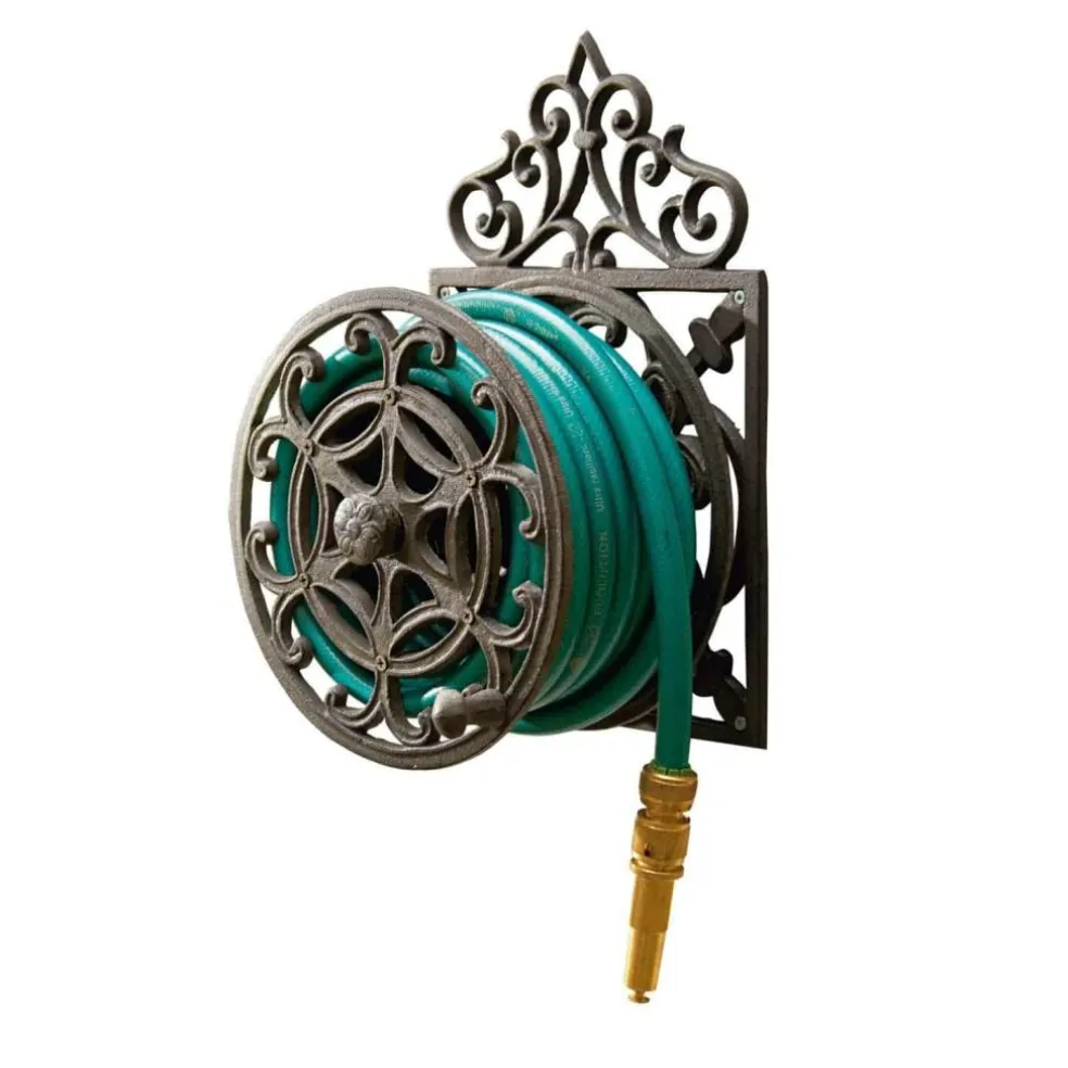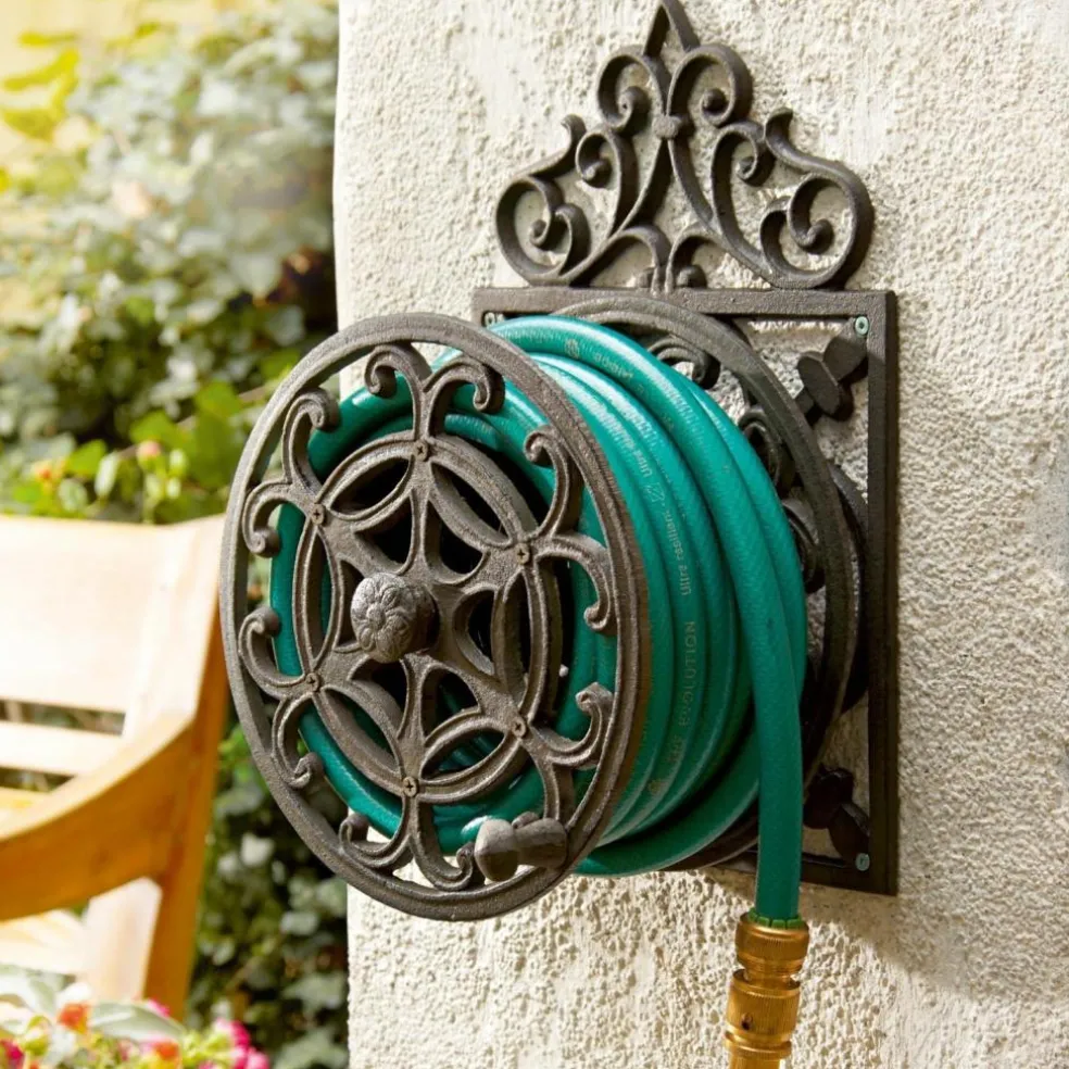 Pratique et esthétique à la fois, en fonte patinée noir. Avec une manivelle pour enrouler et dérouler rapidement le tuyau. Convient pour des tuyaux de 15 m de long env. Cet enrouleur pour tuyau d’arrosage en fonte patinée noir est à la fois pratique et esthétique. Les ornements lui confèrent un charme très stylé. Un partenaire de premier choix pour le jardin ! Sa manivelle facile d’utilisation permet d’enrouler et de dérouler le tuyau rapidement. La fonte résistante aux intempéries doit son caractère unique à son bel effet patiné ancien. Un accessoire essentiel pour l’entretien du jardin ! Installation murale.
