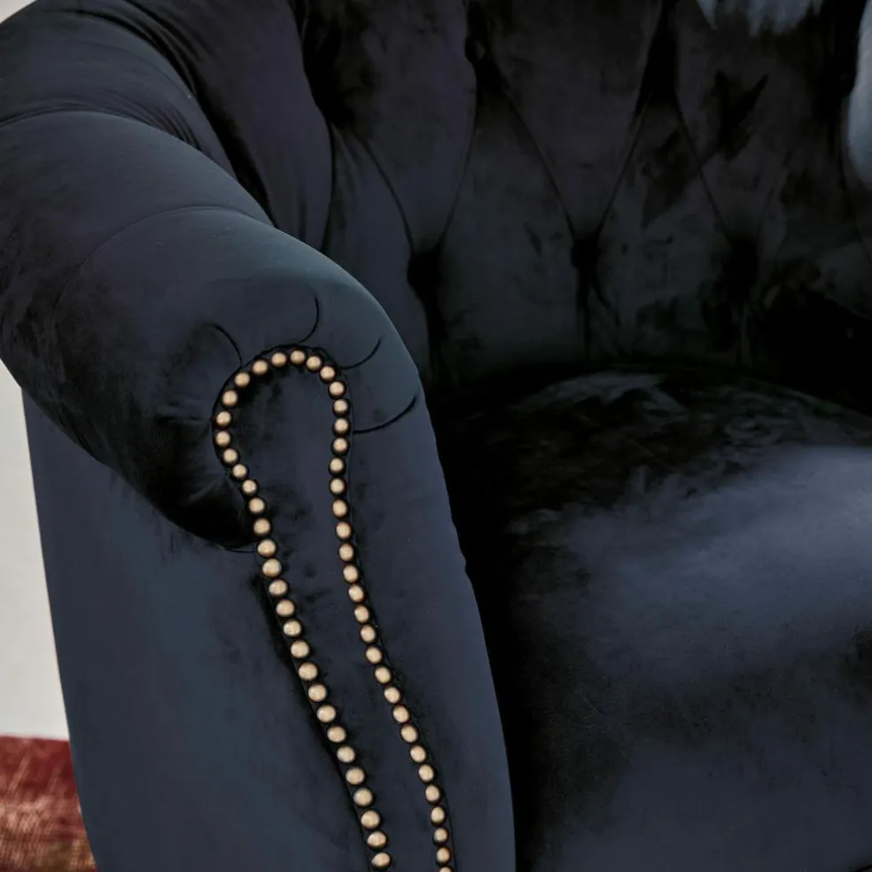 Un modèle classique décliné dans le style traditionnel Chesterfield. Rembourrage ferme recouvert d’un velours très doux. Pieds en bois de caoutchouc tournés à la main. Si vous recherchez un classique intemporel qui dévoile un confort sans limite, le fauteuil Chesterfield est exactement celui qu’il vous faut. En effet, depuis plus de 200 ans, ce style séduit à travers le monde par son agréable confort, et le style de vie anglais raffiné que ce fauteuil diffuse dans la pièce est également très apprécié. Comme le modèle original, ce fauteuil vous offre un véritable confort haut de gamme grâce à un rembourrage agréablement ferme et une assise généreuse pour vous assurer des heures de fin de journée encore plus relaxantes. Contrairement aux modèles précédents, il n’est pas recouvert de cuir, mais d’un tissu de revêtement en matière douce et veloutée en polyester haut de gamme, le rendant ainsi très résistant. Mais même lorsque vous n’êtes pas installé(e) dans ce fauteuil, ses surpiqûres en forme de losange, ses clous tapissier apposés à la main et ses pieds tournés à la main témoigneront de l’expression d’un savoir-faire traditionnel et sauront attirer tous les regards dans la pièce.