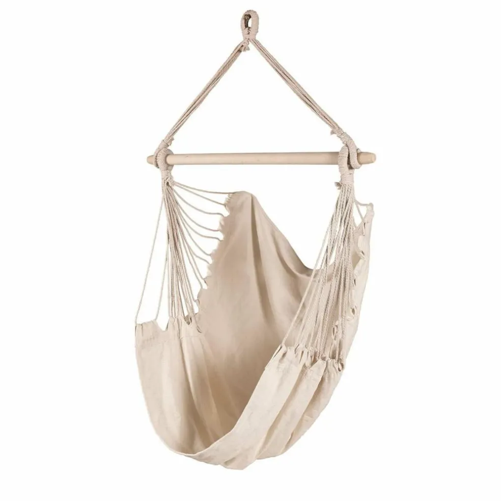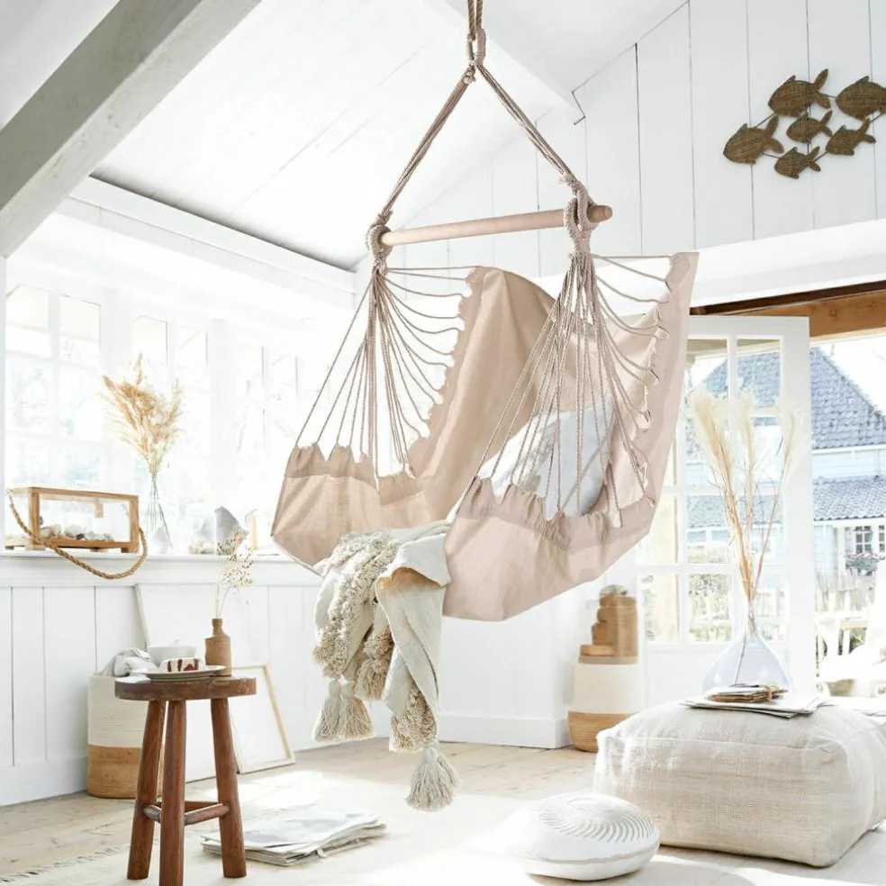 Vous aimez vous balancer et avoir l’impression de flotter dans l’air ? Aucun doute : le fauteuil suspendu « Leano » est fait pour vous ! Suspendu à une grosse branche d’arbre dans le jardin ou à un crochet vissé au plafond du salon, ce fauteuil de couleur crème vous invite à vous détendre et à vous évader de votre quotidien. Le fauteuil, réalisé dans un tissu robuste de coton et accompagné d’un lot de deux cousins confortables, est suspendu à une barre solide en bois de bouleau et à un cordage robuste. Une sécurité optimale quand les pieds ne touchent plus le sol… Ce fauteuil suspendu deviendra rapidement votre cocon de prédilection, lieu de retraite rêvé pour profiter d’après-midi lecture paisible ou savourer de précieux moments de sérénité. Attention : les enfants seront inéluctablement tentés de l’utiliser pour s’essayer à de périlleuses acrobaties mais une fois qu’ils seront couchés, vous aurez votre cocon douillet rien que pour vous.