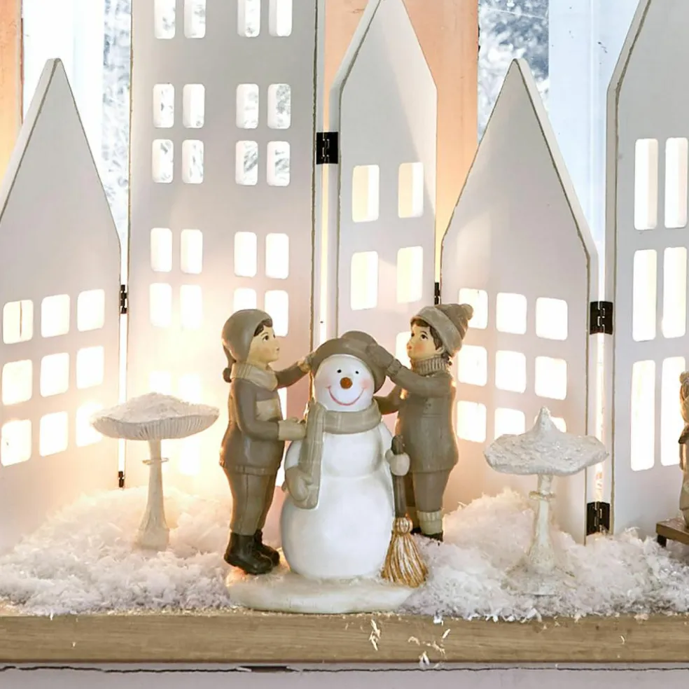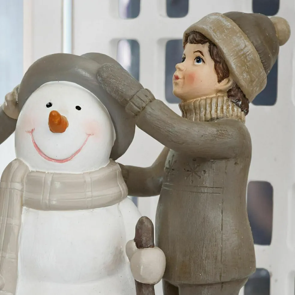 Vivez la magie de l’hiver avec cette charmante figurine décorative peinte à la main. Deux enfants se tiennent joyeusement ensemble et décorent minutieusement leur bonhomme de neige qui, avec son air sympathique et sa tenue classique, fait naître un sourire sur chaque visage. Les couleurs chaudes et harmonieuses, ainsi que la finition détaillée des personnages, donnent un aspect vivant à la scène. Le matériau solide de cette figurine vous permettra d’en profiter pendant longtemps. Que ce soit sur le manteau de la cheminée, sur une table basse ou comme point d’orgue de votre décoration de Noël, cette figurine apportera une touche de magie hivernale à votre intérieur et deviendra à coup sûr l’objet phare de toutes vos décorations de fête.