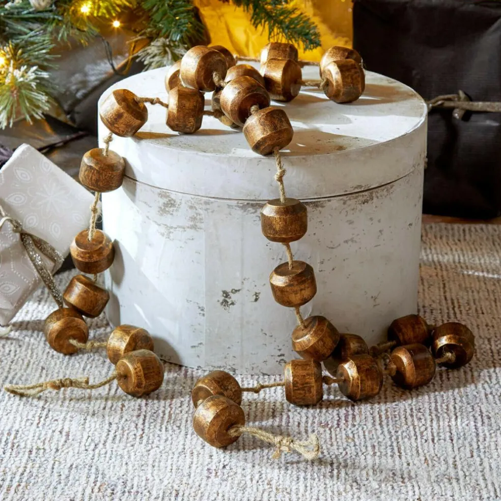 Lorsque le bois rustique rencontre l’éclat délicat du doré, il en résulte une magie toute particulière , cette guirlande d’ambiance en est la preuve. Les perles en bois massif de manguier, de forme légèrement irrégulière, sont recouvertes d’une patine dorée qui fait merveilleusement briller ce matériau chaleureux. Enfilées sur un solide fil de jute, elles forment un élément décoratif qui respire le naturel tout en étant noble. La structure authentique des perles et le contraste entre le matériau naturel mat et la surface brillante font de cette guirlande un compagnon polyvalent tout au long de l’année, que ce soit comme accent festif en hiver ou comme point fort rustique dans le style bohème chic.