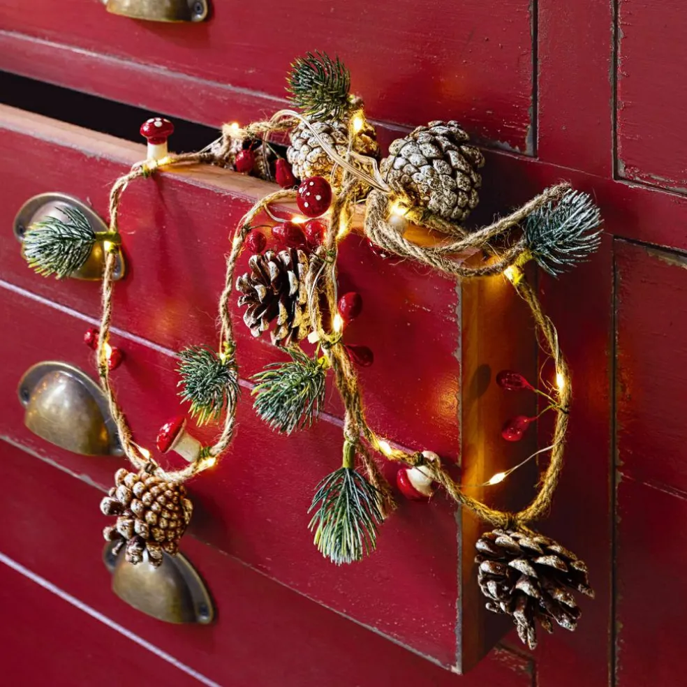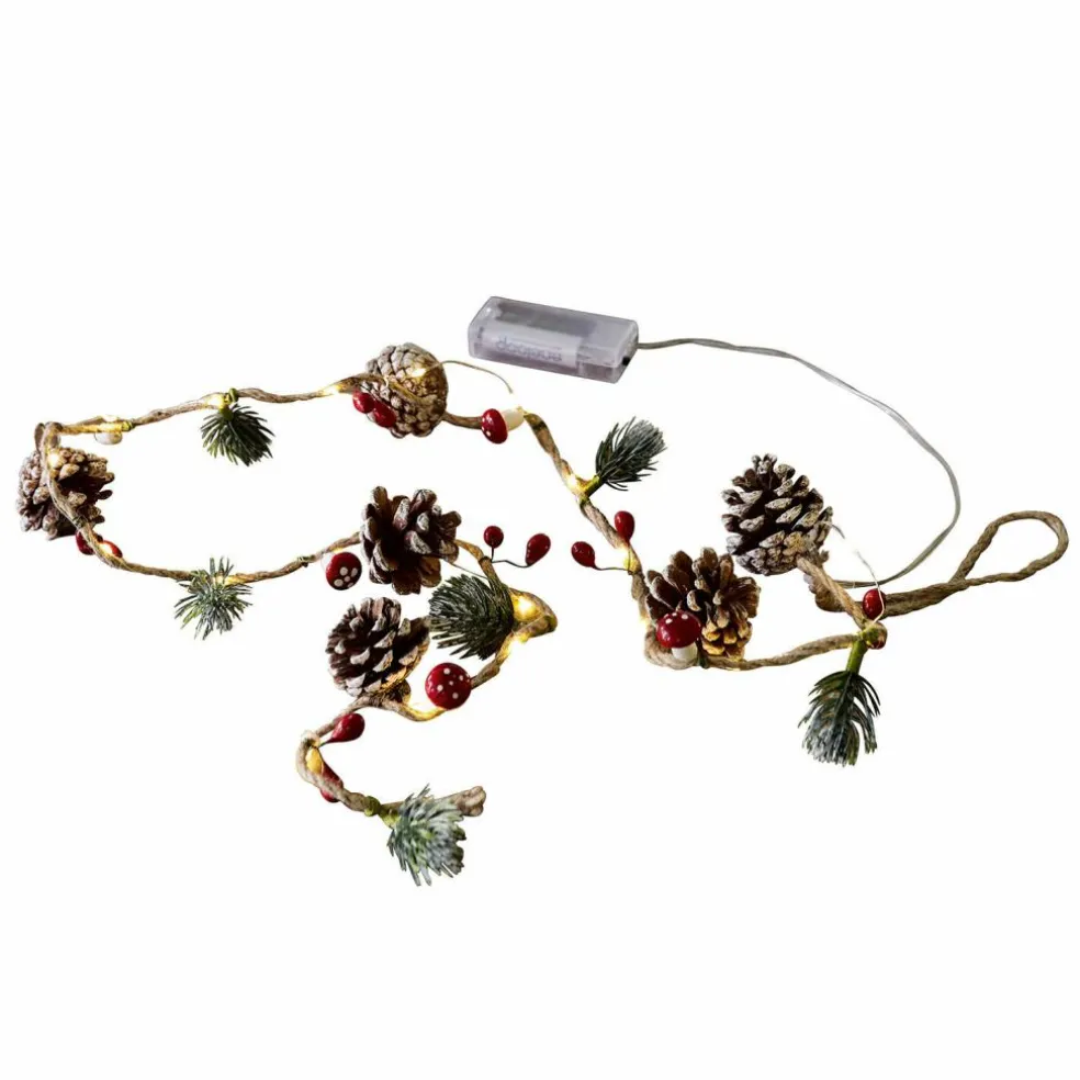 Un style merveilleusement naturel avec 20 LED blanc chaud. Pommes de pin véritables, baies et champignons décoratifs Charmante cordelette en fibres de lin. Cette superbe guirlande lumineuse ne passe pas inaperçue. Allumée comme éteinte, elle distille une atmosphère chaleureuse dans votre intérieur et constitue une décoration absolument charmante. Ce joli accessoire inspiré de la nature est orné de détails harmonieux. Ravissant avec un style champêtre ! Comme il fonctionne à piles (non fournies), ce joli modèle est totalement mobile et peut être placé n’importe où, que ce soit sur le lit à baldaquin, la fenêtre ou le manteau de cheminée. Une belle décoration qui convient en toute saison et qui rendra vos précieux moments de bien-être chez vous encore plus merveilleux.