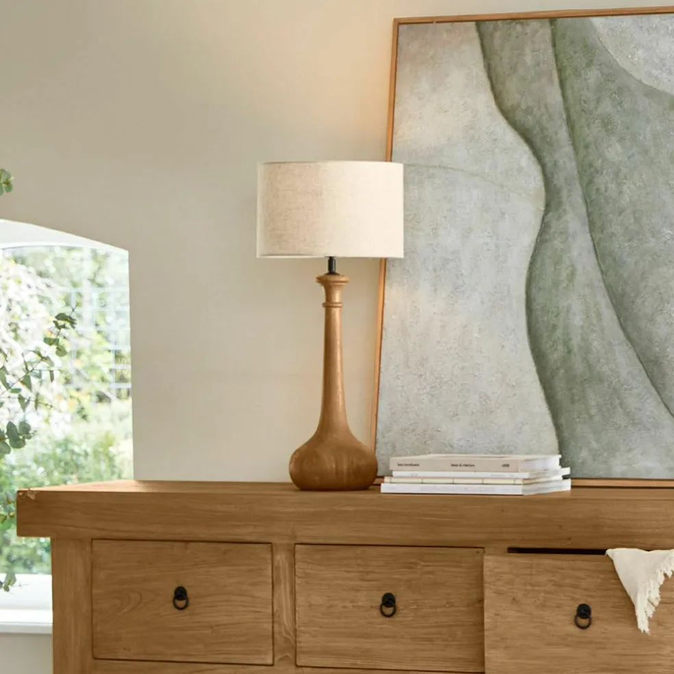 Un accessoire qui inspire la sérénité : cette lampe de à poser est bien plus qu’une simple source de lumière. Le pied en bois de manguier massif se rétrécit élégamment vers le haut et séduit par sa structure naturelle qui révèle sans cesse de nouvelles facettes en fonction de l’incidence de la lumière. L’abat-jour en lin finement tissé dans un ton naturel clair souligne le caractère chaleureux du luminaire et crée un jeu de lumière particulièrement doux. Que ce soit sur une commode dans le salon ou sur une table de nuit, elle apporte une chaleur organique à n’importe quelle pièce et accompagne avec style les soirées agréables.