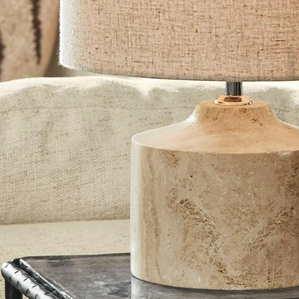Une alliance de pierre et de tissu qui respire le naturel et l’élégance : cette lampe à poser est bien plus qu’une source de lumière. Le pied en travertin impressionne par ses douces nuances de terre et la texture unique de la pierre naturelle. L’abat-jour en lin clair complète le tout avec sa structure fine et offre une lumière douce et agréable. Que ce soit sur un buffet, une table de chevet ou dans une pièce importante comme le salon, cette lampe confère une atmosphère chaleureuse et cozy à n’importe quelle pièce.