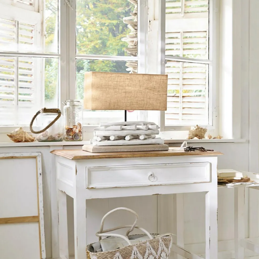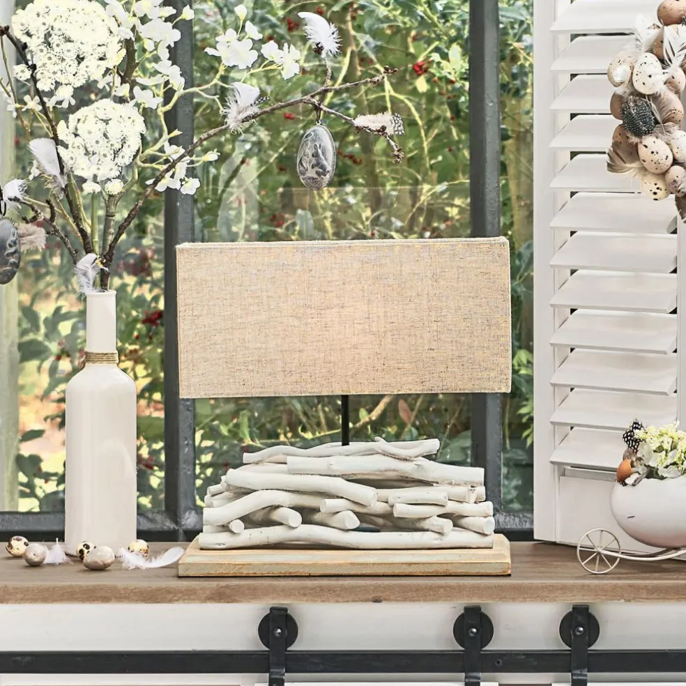 Le pied de cette lampe à poser est réalisé à la main avec des branches de bois flotté : chaque lampe est unique ! Cette lampe aux accents maritimes puise son style classique dans son pied élancé en métal et son abat-jour en lin et coton de coloris lin. Sa forme droite et simple contraste avec style avec la « pile » de branches de bois flotté et viendra illuminer, au sens propre du terme, votre commode ou votre table d’appoint.