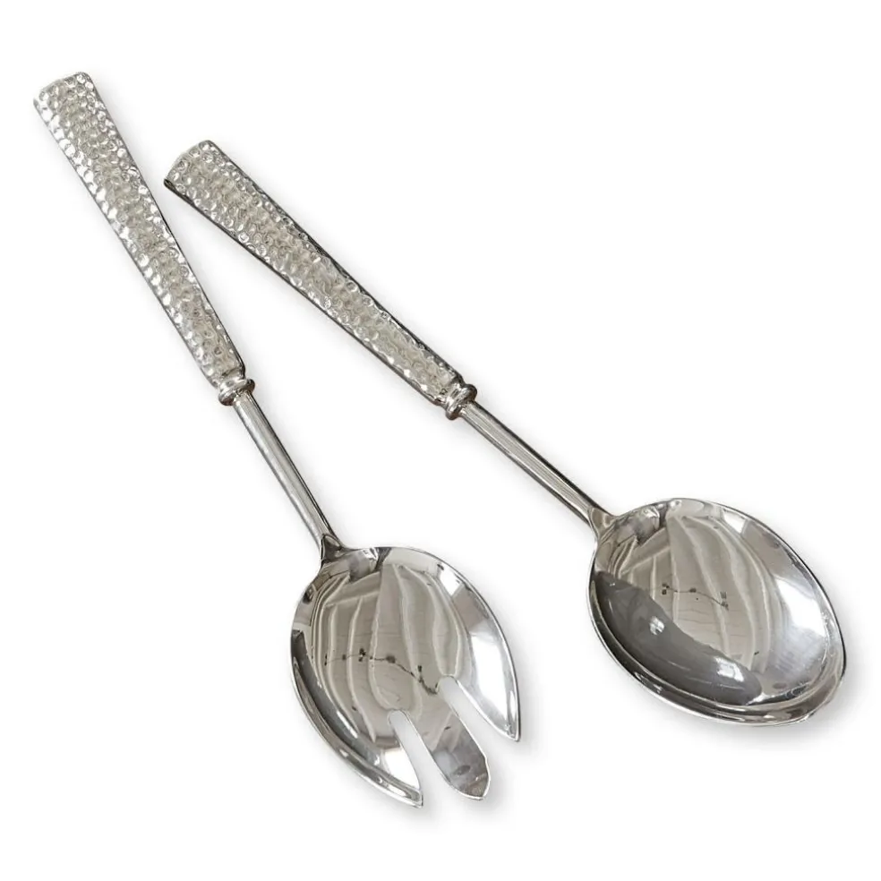 Manches en laiton finement martelé. Style classique et intemporel en inox. Faciles à laver au lave-vaisselle. Vos couverts seront ainsi toujours étincelants ! Ces merveilleux couverts orneront votre table tout en faisant preuve d’une grande utilité : installez-vous confortablement à table et dégustez une bonne salade composée ! Vos repas seront encore plus délicieux servis sur une table bien mise avec ces charmants couverts. Cet ensemble plein d’élégance vous permettra de servir facilement salades vertes, salades de tomates ou de pomme de terre. Des accessoires haut de gamme dont vous profiterez des années durant, vous comme vos invités !