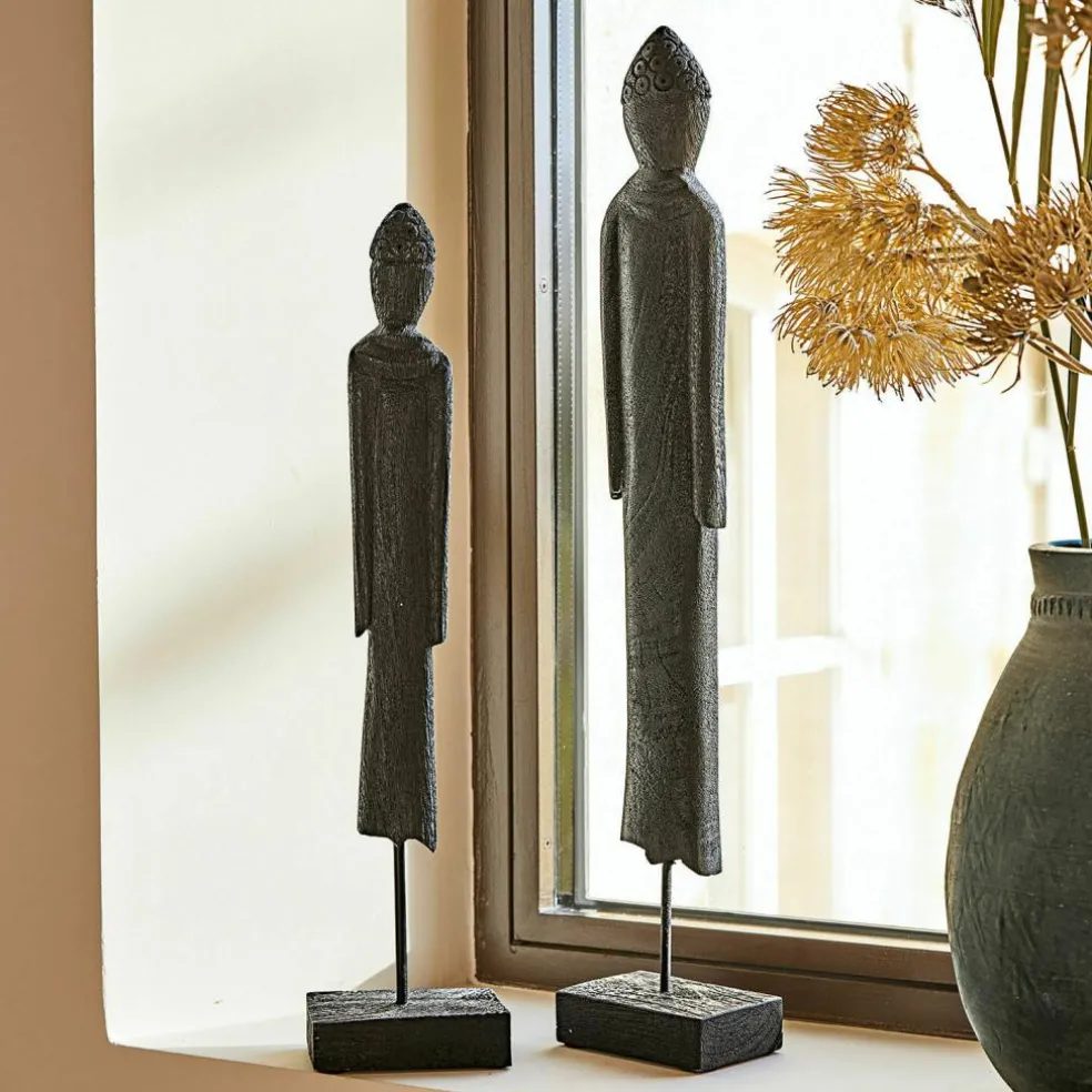 Ces sculptures intemporelles en bois de manguier précieux racontent en silence des histoires d’amour et d’intimité. La finition au sablage leur confère une texture unique, agréable au toucher et au regard. Leur allure épurée et leur présence charismatique apporteront une touche de charme et de sens à la pièce. La palette sombre et la silhouette élancée des figurines créent une présence mystique invitant à réfléchir aux relations humaines et à la simplicité de l’être. Une pièce captivante qui trouvera sa place aussi bien dans des décors modernes que traditionnels.