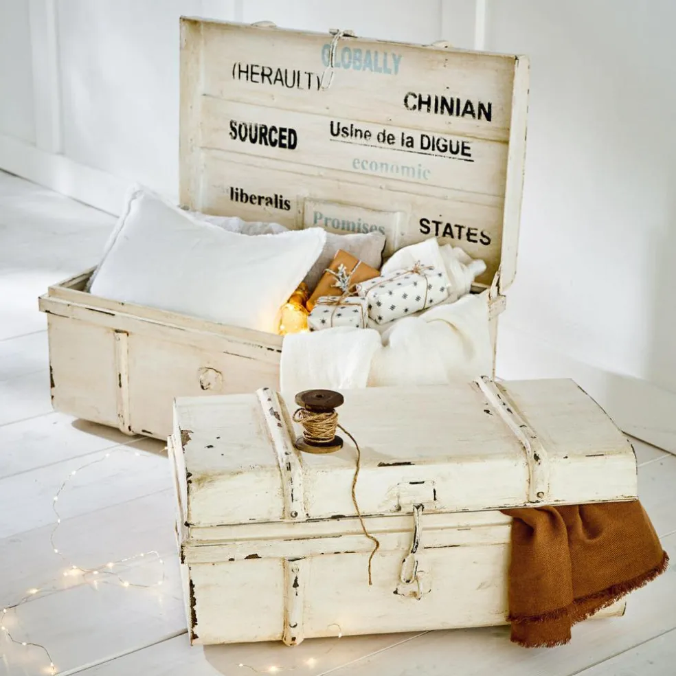 Composé de deux malles à l’ancienne, ce lot a été réalisé à la main en métal et revêtu d’une finition blanc vieilli. Mieux encore : à l’intérieur, des inscriptions imprimées originales accentuent le charme si particulier de ces accessoires d’intérieur pratiques et décoratifs. Le lot se compose de deux malles de différentes tailles. Les malles peuvent également faire office de sièges d’appoint.