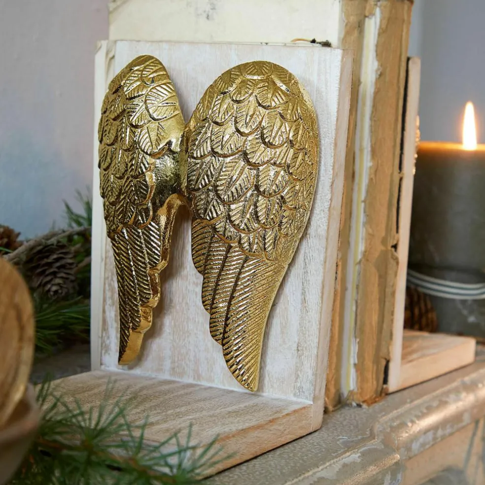 Les ailes d’ange: un symbole de protection, de légèreté et d’inspiration. Avec ce lot de serre-livres, elles deviennent un point de mire rayonnant sur une étagère ou une table d’appoint. Les ailes en fonte d’aluminium dorée impressionnent par leur fine structure en relief et brillent en douceur en fonction de l’incidence de la lumière. Le bois de manguier clair à la finition blanchie forme un contraste doux et naturel qui semble faire flotter les ailes. Que ce soit dans un espace de lecture, comme détail poétique au salon ou comme idée de cadeau pour l’élu.e de votre cœur, cet ensemble met en valeur vos livres préférés.