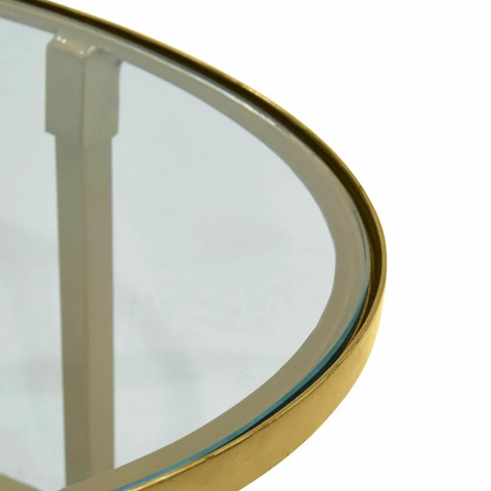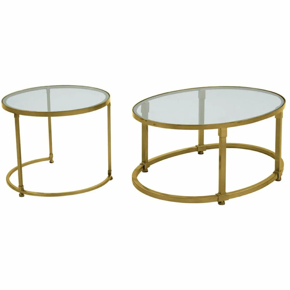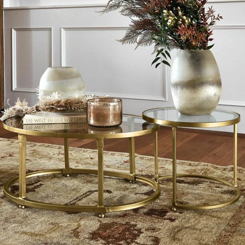 Seule, un meuble polyvalent Piètement en métal solide avec patine à l’ancienne couleur laiton. Une table de forme ovale, une autre ronde. Un ensemble de tables des plus exquis se distinguant par un mélange réussi de nostalgie et d’intemporalité. De très belle confection avec un piètement en métal solide à la patine à l’ancienne couleur laiton, elles rappellent le style Art Déco glamour des années 20. Le plateau en verre épuré apporte visuellement une touche de légèreté et pourra accueillir de beaux accessoires de décoration et bien plus encore. Elles se complètent aussi bien au niveau de la taille que de la forme : la grande table est de forme ovale, la plus petite ronde. Chaque exemplaire est en soi une réussite esthétique. En duo, elles se complètent l’une et l’autre avec brio sans pour autant attirer trop l’attention. Vous apprécierez sans aucun doute leur polyvalence : comme table basse, table d’appoint à côté de votre fauteuil favori ou peut être comme table de chevet dans la chambre à coucher. Parfait avec du mobilier classique, charmant en contraste avec du design moderne.
