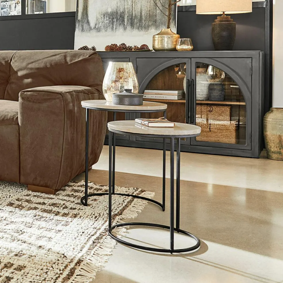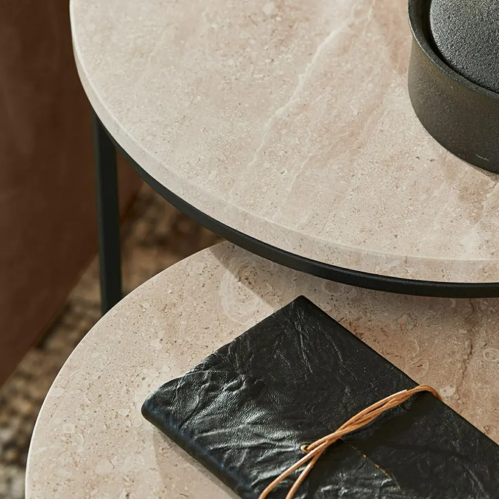 Ce superbe lot de tables d’appoint offre une élégance intemporelle à chaque pièce. Uniques grâce à leurs couleurs et leurs motifs différents, les plateaux en travertin sont non seulement très jolis à regarder, mais aussi agréables à toucher. Le solide cadre en métal confère une stabilité et un aspect filigrané. Emboîtables, ces tables offrent non seulement une jolie surface de rangement, mais aussi une solution pratique pour un habitat peu encombrant. Laissez-vous séduire par la beauté naturelle et la polyvalence fonctionnelle de ce lot !