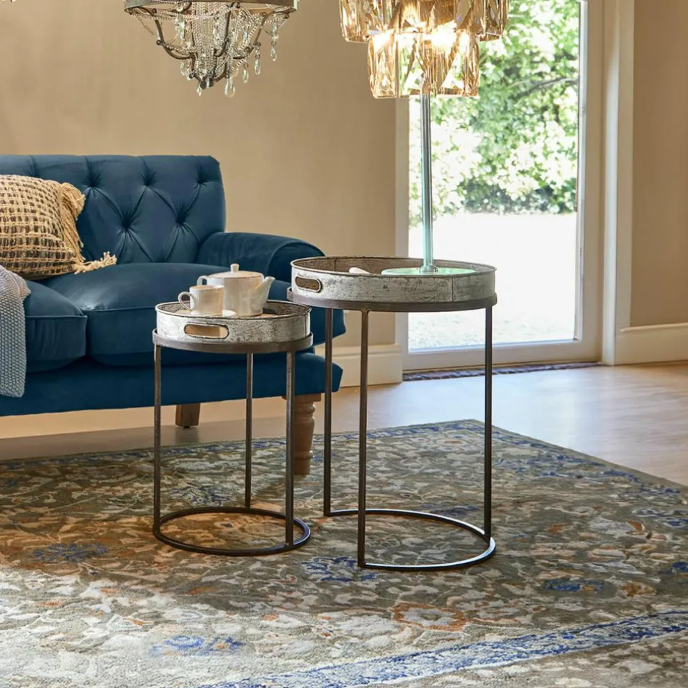 Un duo polyvalent au style industriel. En métal, plateaux rehaussés d’une patine à l’ancienne. Pratique : les tables peuvent être rangées l’une dans l’autre et les plateaux sont amovibles. J’en sors une ou bien les deux ? Il n’y a que vous qui pouvez répondre à cette question. Bien entendu, la réponse dépend de la situation, et ce lot de tables gigognes s’adaptera parfaitement à vos besoins. Parfois, vous vous installez confortablement pour regarder un bon film et tirerez la plus petite table vers vous pour pouvoir y poser des boissons et apéritifs juste à côté de votre fauteuil préféré. À d’autres moments, vous rangez à nouveau la petite table sous la grande pour libérer de l’espace dans la pièce. Grâce à leur esthétique irréprochable, ces tables gigognes allient l’utile à l’agréable. Les lignes sobres sont en parfaite harmonie avec le métal foncé qui procure aux tables un look industriel chic très tendance, tandis que les plateaux sont rehaussés d’une élégante patine à l’ancienne. Ces derniers étant des véritables plateaux, vous pourrez les retirer et les emporter à la cuisine à l’aide de leurs poignées creuses, pour les rapporter auprès de vos convives quelques instants plus tard.