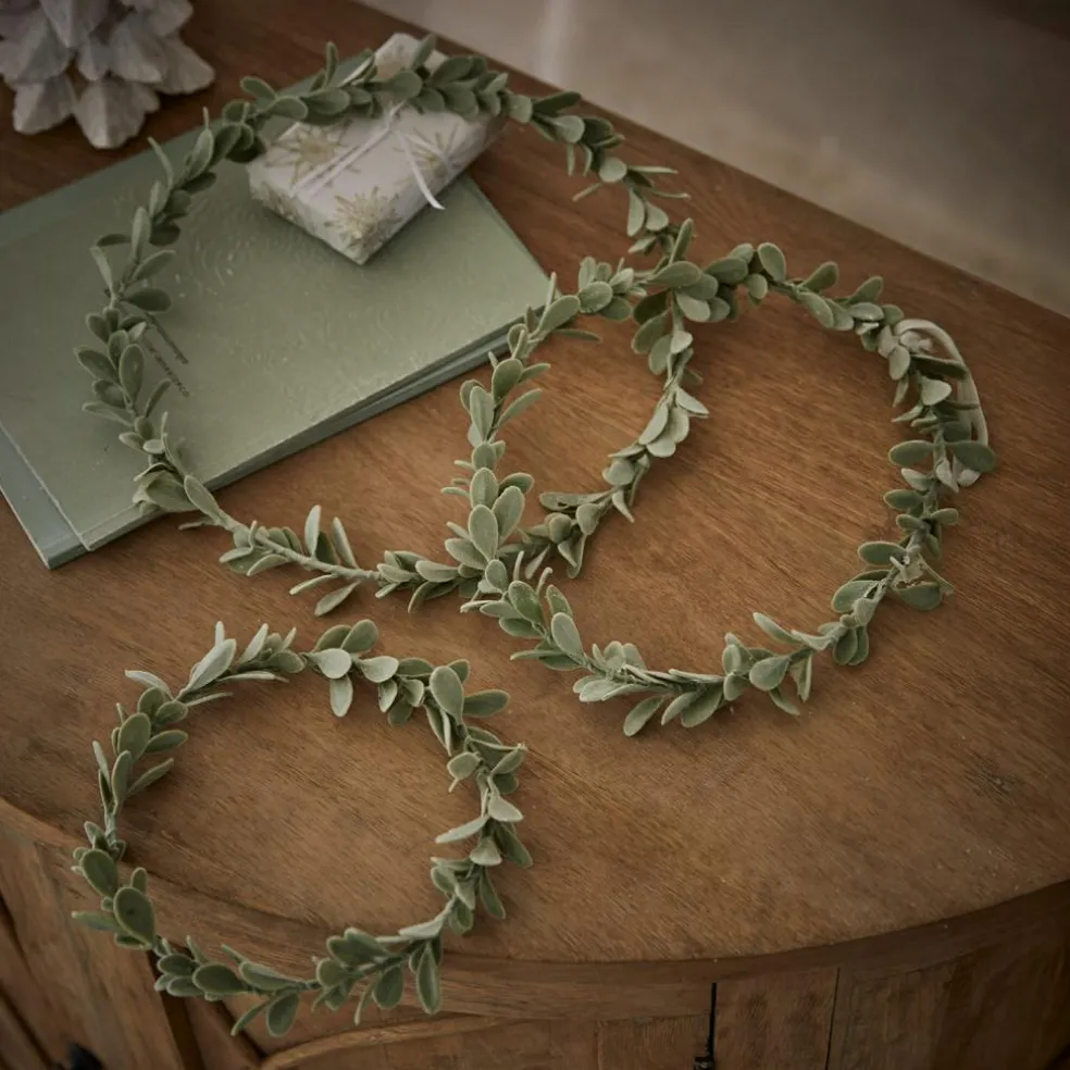 Caressée de délicats rayons de soleil, cette couronne composée de trois anneaux de tailles différentes se fond dans votre intérieur. Les fines feuilles vert clair à la finition poudrée rappellent les feuilles du petit matin au printemps : douces, légères et pleines de grâce. Chaque couronne est flexible et s’adapte facilement : qu’elle soit de forme ronde, légèrement ovale ou entrelacée, selon votre humeur créative. Le ruban beige à suspendre s’intègre discrètement à l’ensemble et rend le trio parfait pour une porte, au mur ou à la fenêtre. Un accroche-regard qui marque des points par son élégance naturelle, tout au long de l’année.