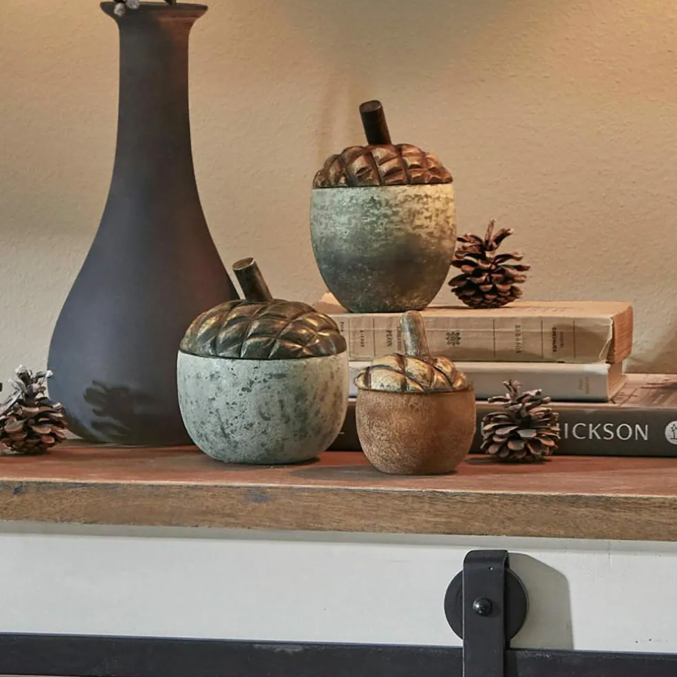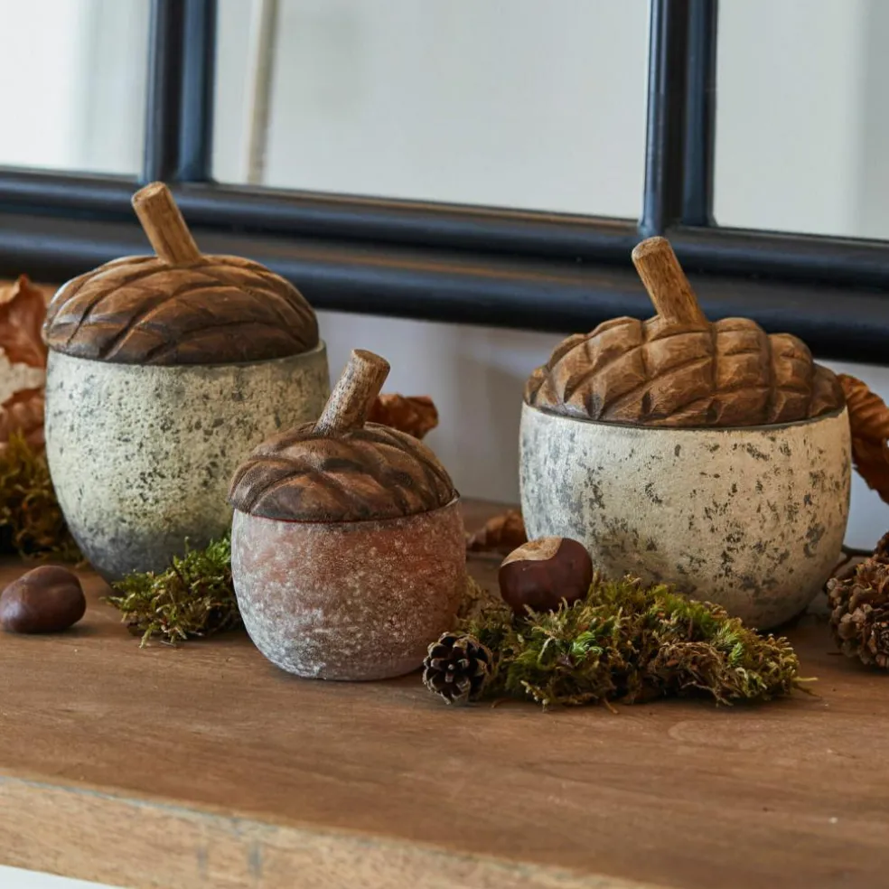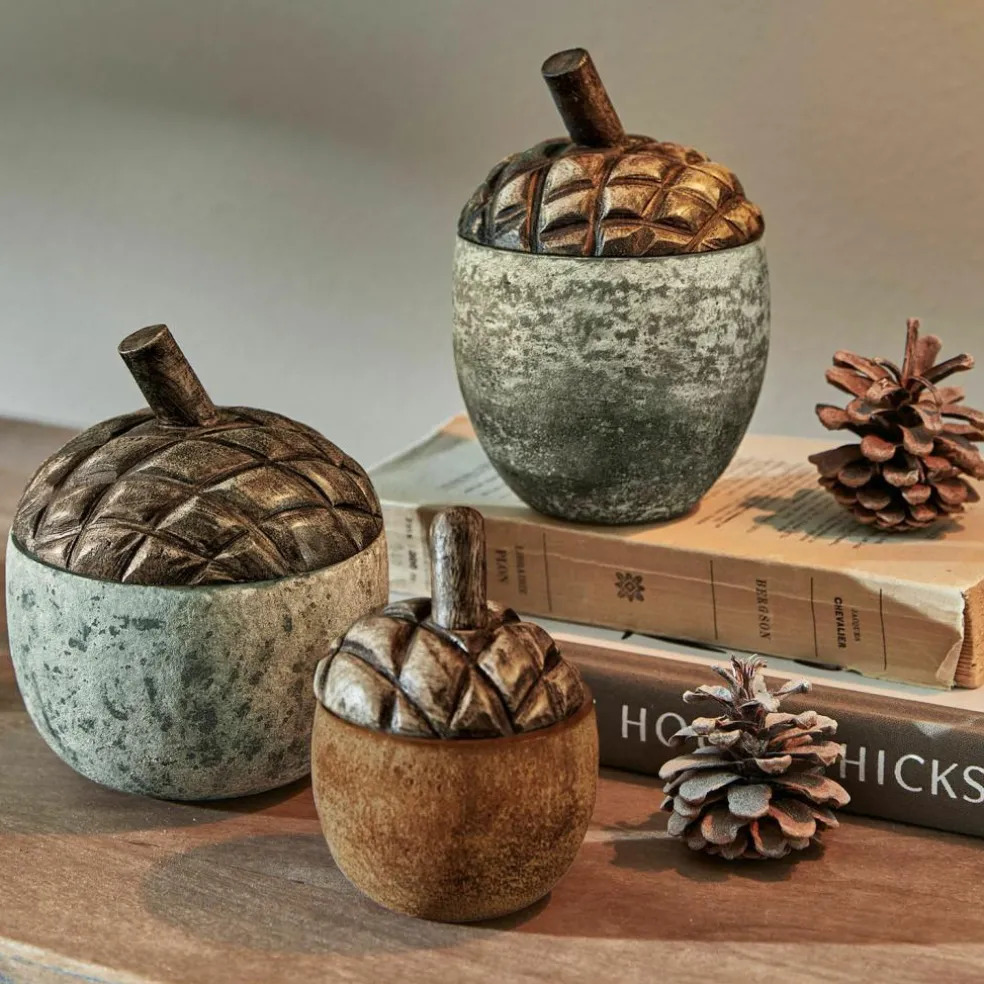 Ravissants récipients en verre épais au revêtement rugueux unique. Couvercle en manguier sculpté à la main en forme de gland. Trio décoratif pouvant servir de rangement. Ce ravissant trio en trois tailles s’inspire de la nature. Il est parfait pour ranger vos petites affaires, telles que des clés, de la monnaie ou des bijoux. Dans la salle de bains, il pourrait par exemple servir à présenter les cotons ? Mais même utilisées de manière purement décorative, ces trois charmantes boîtes en forme de gland feront toujours bonne figure, que ce soit comme décoration de table ou dans une étagère. Elles s’harmonisent très bien avec le style maison de campagne et constituent un véritable point de mire en automne ! L’association du verre et du bois est particulièrement charmante.