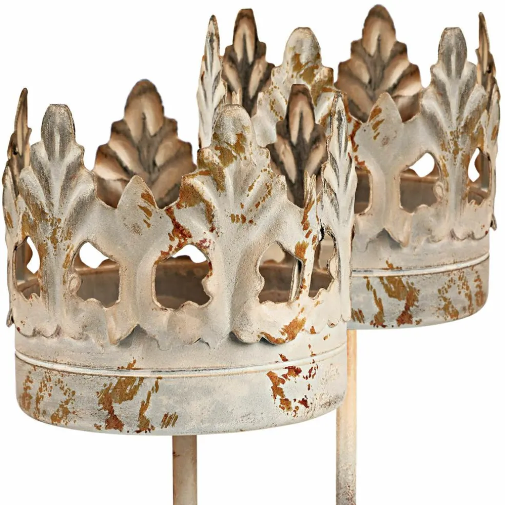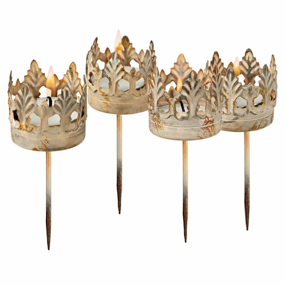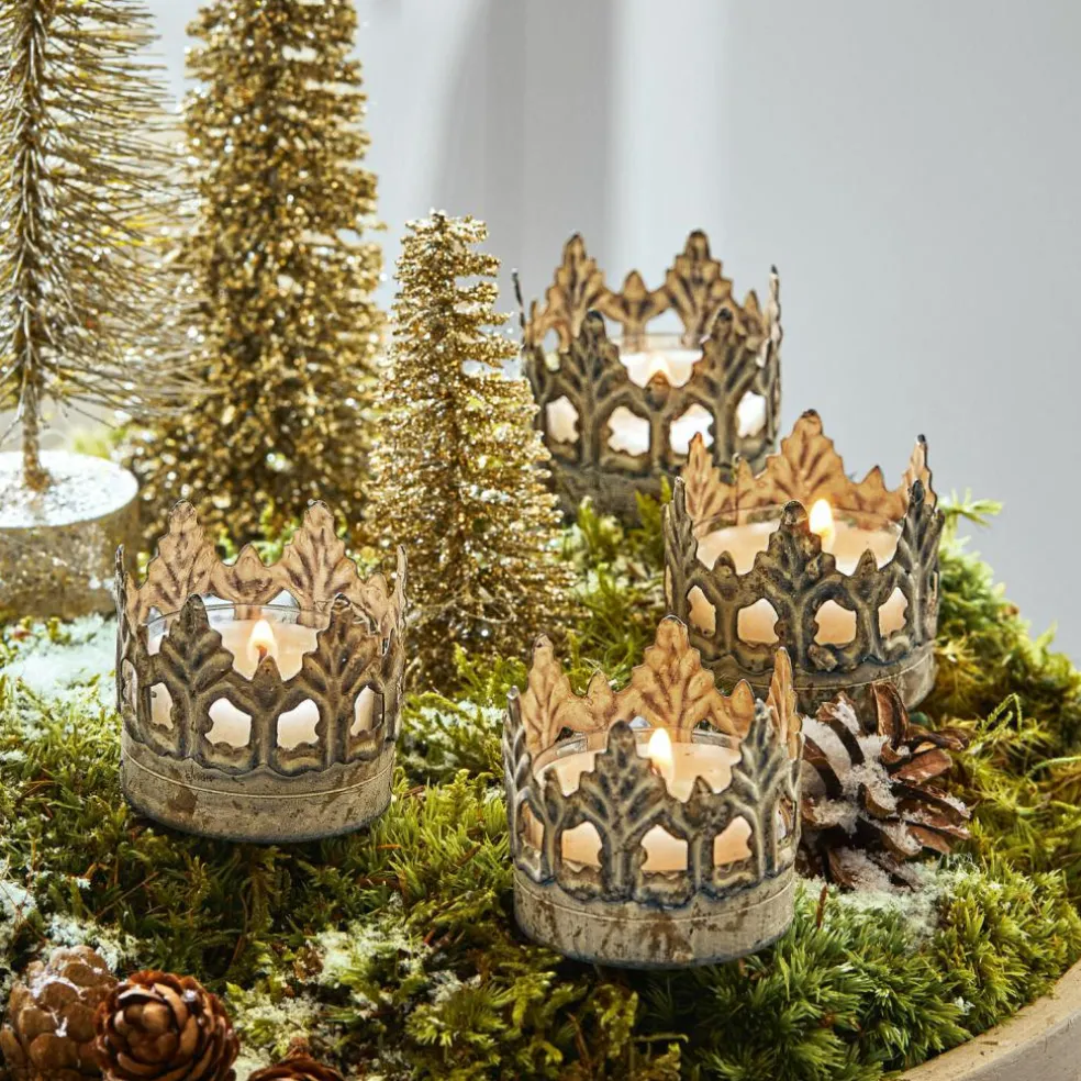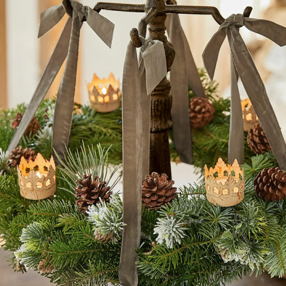 Aspect royal très séduisant. Style nostalgique, en métal avec une finition vieillie. Polyvalent : agrémente une couronne de l’Avent ou un pot de fleurs. Ces photophores en forme de couronnes s’intègreront parfaitement dans un style shabby-chic. Ils produiront un effet des plus romantiques avec leur lueur délicate et leur style séduisant. Vous pourrez par exemple les placer dans une coupelle remplie de sable ou dans un verre pour un effet très créatif. Ces photophores embelliront chaque pièce de la maison : profitez du spectacle qu’ils vous offrent tout au long de l’année !