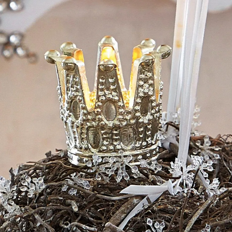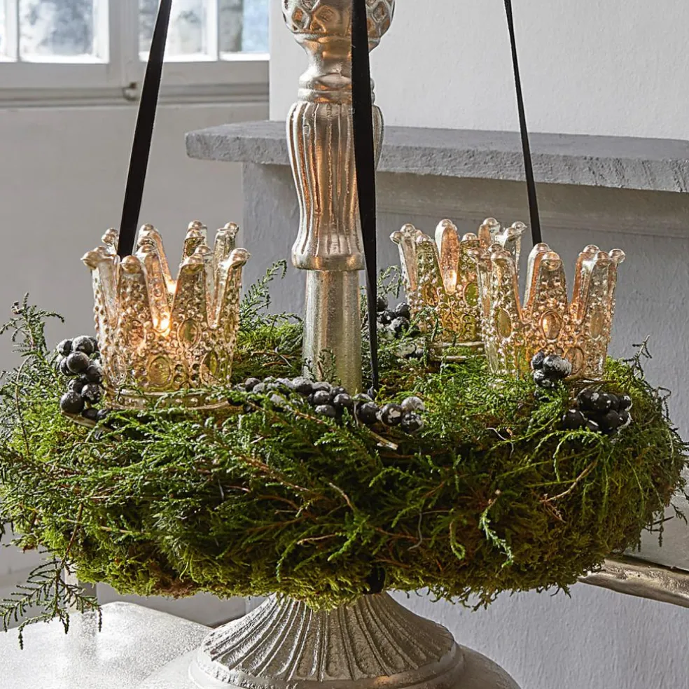 Ce lot à l’allure royale comprend quatre photophores originaux. Ils sont en verre, en forme de petites couronnes, avec des miroirs à l’intérieur et de belles décorations à l’extérieur. Les quatre couronnes peuvent être équipées d’une bougie chauffe-plat et scintillent merveilleusement à la lueur de la flamme de la bougie. Elles sont également superbes pour orner votre couronne de l’Avent !