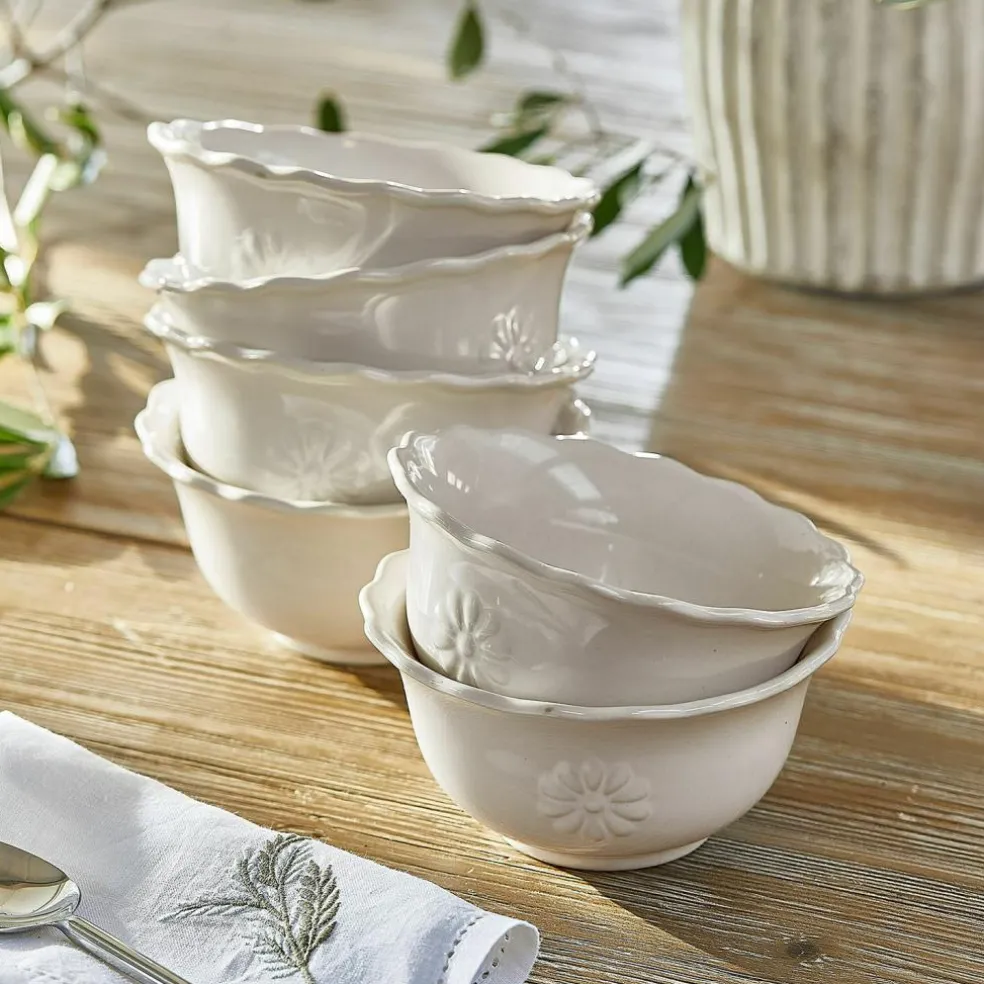 Apportez une touche d’élégance intemporelle à votre table avec cet ensemble de 6 bols. Ce modèle raffiné en grès est orné d’une fleur finement estampée qui dégage un charme discret. Les bords striés et la finition blanc brillant font de ces bols des objets polyvalents, parfaits pour les salades comme pour les desserts. Grâce à leur forme harmonieuse, les bols s’intègrent dans toutes les décorations de table et sont parfaits pour un usage quotidien ou pour des occasions festives.
