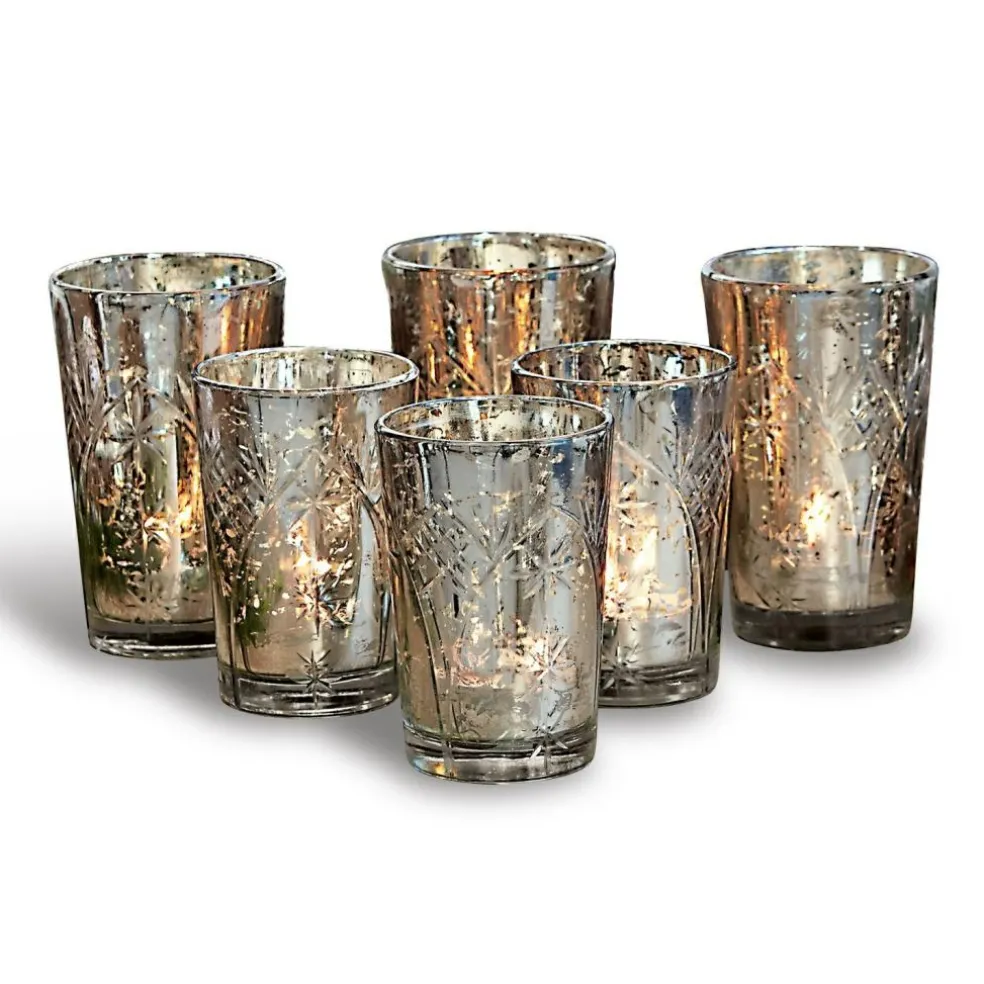 Motif artistique en verre mercuré. C’est un ensemble de six photophores argentés qui vous est proposé ici. Idéal pour y disposer des bougies chauffe-plats. En forme de coupe et légèrement conique, ces photophores à la finition couleur argent vieilli séduisent par leurs gravures délicates. Ils réfléchissent parfaitement la lumière des bougies. Ce lot de 6 photophores comprend trois pièces de deux tailles différentes, ce qui permet de créer de jolis arrangements. Ces petits bijoux ne font pas qu’embellir vos pièces ou vos tables pendant les fêtes, la magie argentée de leur qualité ornementale continue d’attirer les regards pendant les longs mois d’hiver. Et le charme traditionnel de leur couleur argent vieilli continue d’opérer au cours des autres saisons. De plus, l’utilisation de ces photophores en verre est multiple : utilisez-les en tant que mini vase pour vos fleurs ou comme rangement pour stylos ou pinceaux de maquillage. Un ensemble qui s’intègre parfaitement à tous les styles d’intérieur notamment romantique, Shabby chic ou d’inspiration orientale.