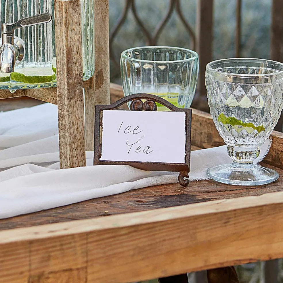Apportez une touche de raffinement et d’élégance à votre table avec ce lot de 6 porte-cartes en fonte. Malgré le caractère solide de la fonte, la matière a ici été travaillée avec de nombreux détails pour faire de chaque pièce une petite œuvre d’art. Comme support pour afficher des informations importantes lors d’événements festifs, pour présenter vos cartes de visite avec style ou encore comme partie intégrante de votre décoration de table, ces porte-cartes se sont pas seulement pratiques mais constituent aussi l’expression de votre style et de votre bon goût en matière de décoration. Ils sont la preuve que même les accessoires les plus petits peuvent avoir un grand effet sur l’atmosphère générale d’une pièce.