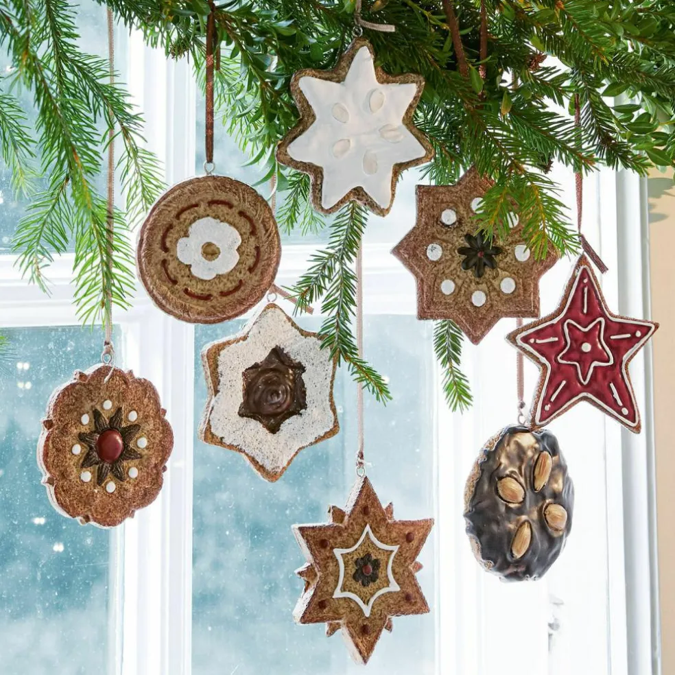 On croirait de délicieux petits gâteaux de Noël ! En polyrésine peinte à la main, très détaillée. Diverses formes très appétissantes ! Ces décorations nostalgiques sont conçues avec une grande finesse. Chacune est dotée d’un ruban pour la suspendre. On aimerait les croquer, tant ces petits gâteaux décoratifs ont l’air vrai ! Étoiles à la cannelle et autres gourmandises rappellent les préparatifs de Noël de notre enfance. Avec ces décorations, votre fenêtre sera certainement la mieux décorée pour Noël ! Vous pourrez également placer ces décorations finement ornées et vernies sur des branches de sapin, une couronne de l’Avent et, bien évidemment, sur votre sapin de Noël ! Une belle touche classique pour des fêtes réussies, placées sous le signe du bonheur et de la joie retrouvées de l’enfance !