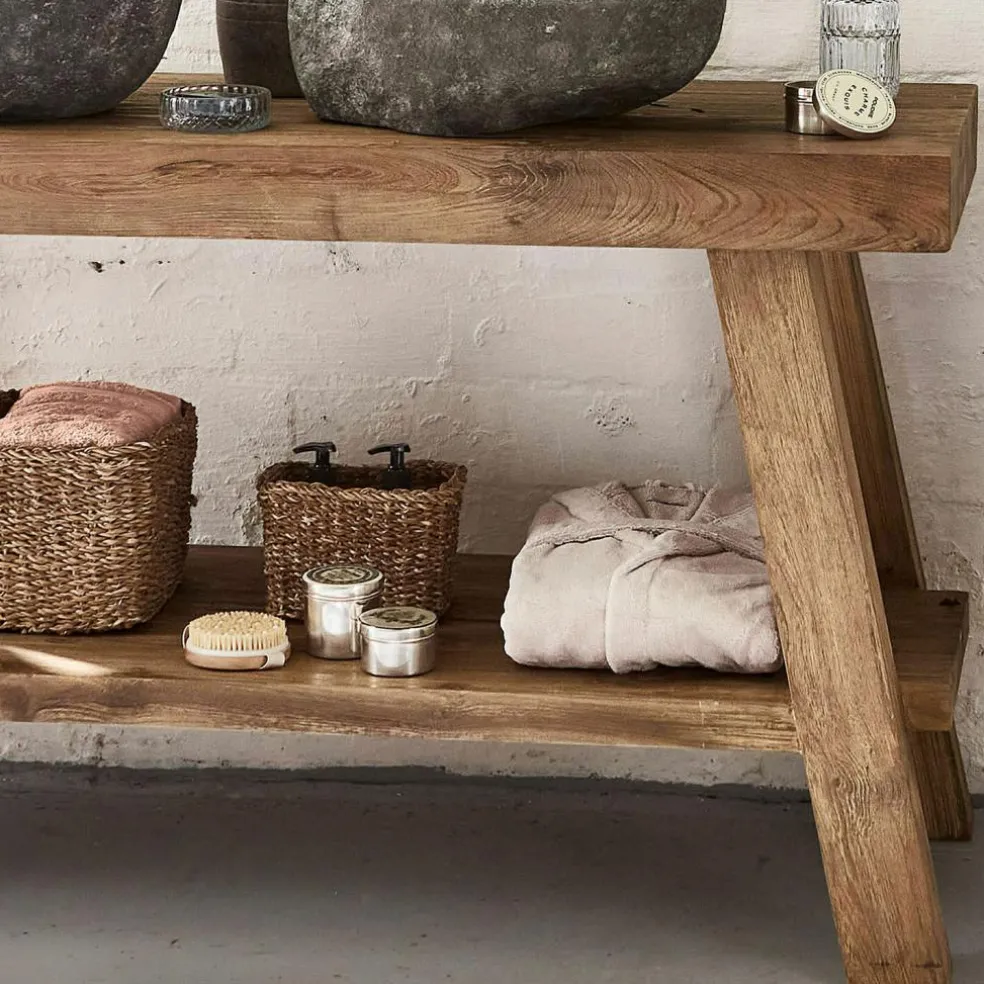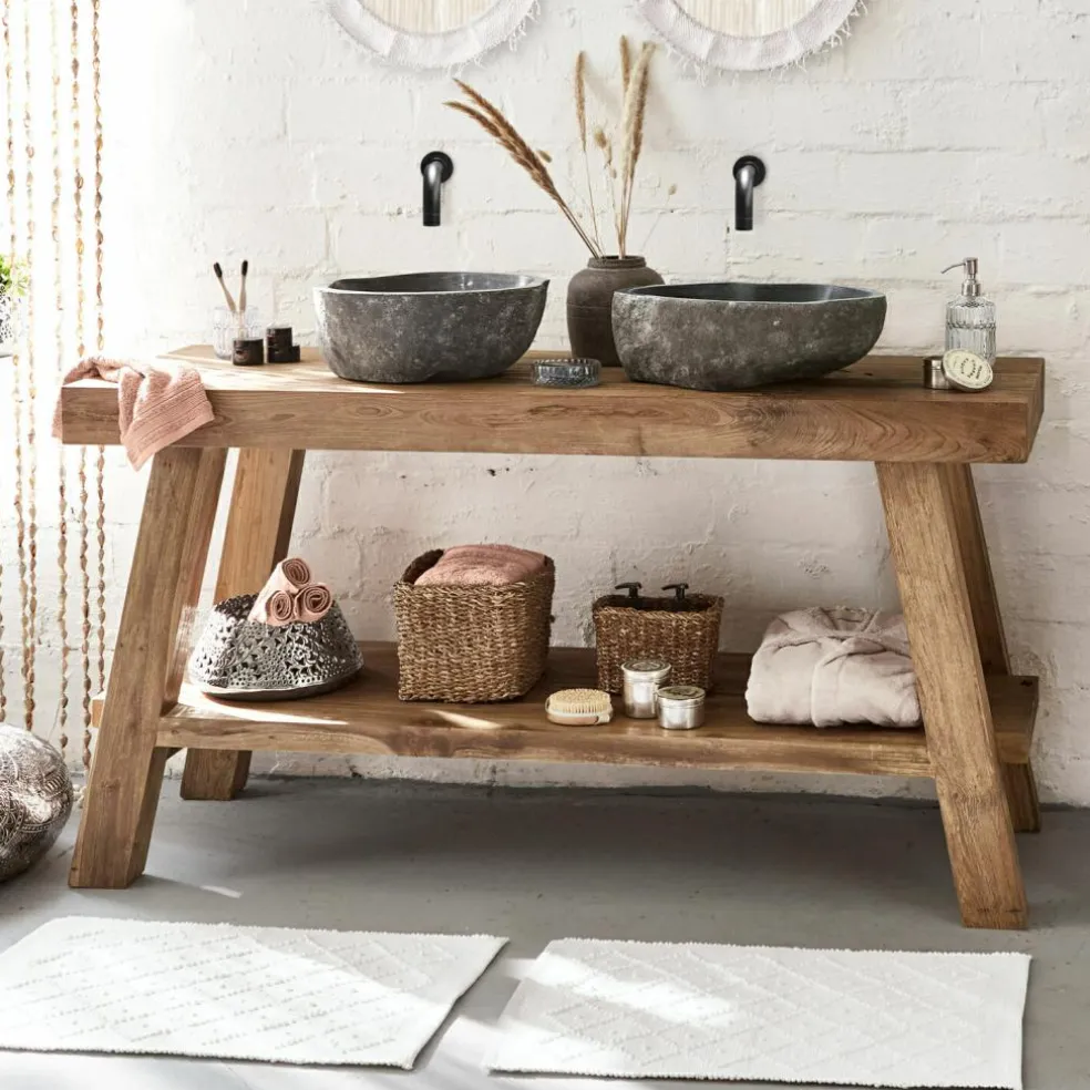 Commencer sa journée avec style et terminer sur une note relaxante le soir, c’est possible ! Pour cela, l’aménagement de votre salle de bains exige le même amour et le même soin que vous avez apporté aux autres pièces. Ce meuble double-vasque formera une base idéale pour votre spa personnel ! Car il s’agit à la fois d’un meuble fonctionnel, mais aussi d’un superbe point de mire qui célèbre la beauté de la nature et le savoir-faire artisanal traditionnel. Ce meuble double-vasque a été conçu en bois de teck haut de gamme et laissé au naturel pour mieux vous séduire avec son superbe veinage apparent. Les tablettes sous le meuble sont parfaites pour ranger serviettes et compagnie. Mais ce qui rend ce meuble si unique, ce sont surtout ses deux précieuses vasques en pierre naturelle authentique. Chaque pièce est absolument unique, ce qui confère au meuble un caractère aussi noble que luxueux. L’extérieur des vasques affiche une surface de pierre naturelle rustique tandis que l’intérieur est poli et parfaitement lisse pour faciliter leur nettoyage. Les vasques sont dotées d’ouvertures pour le siphon tandis que la table en teck doit encore être percée : c’est donc vous décidez de l’endroit précis où vous souhaitez poser les vasques.