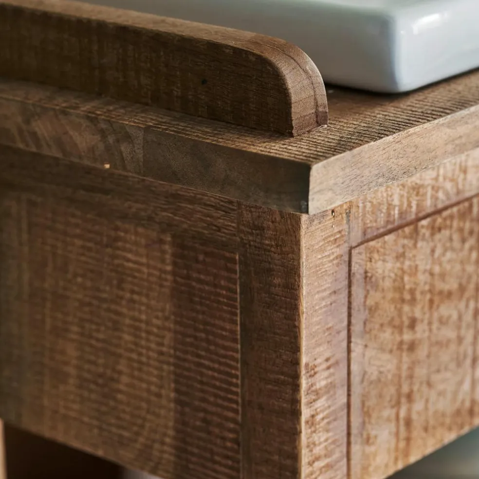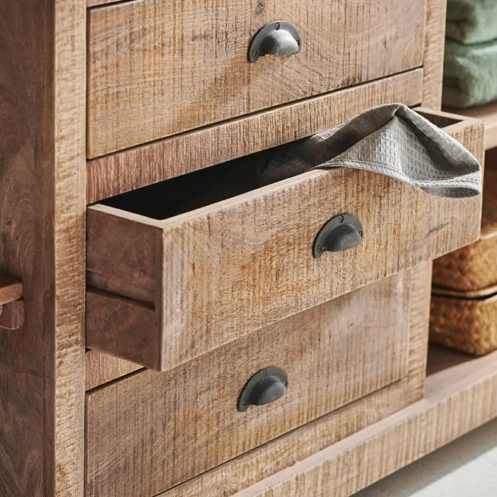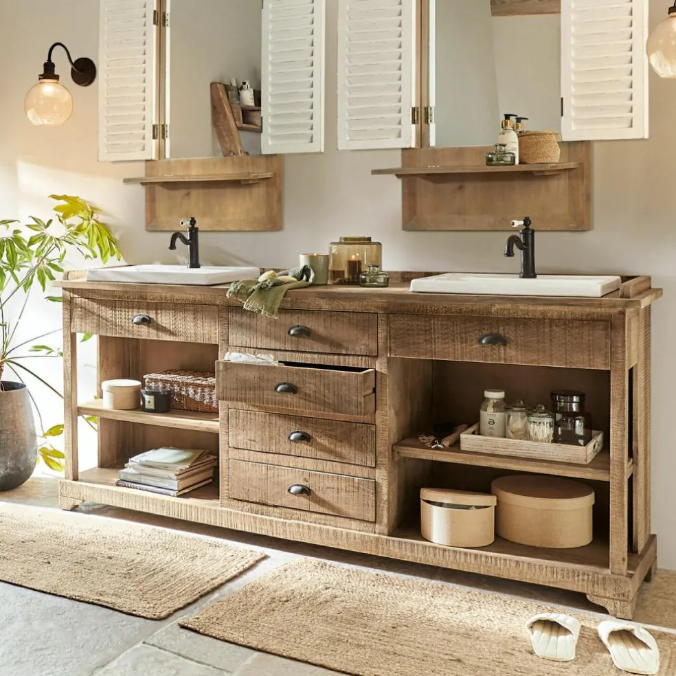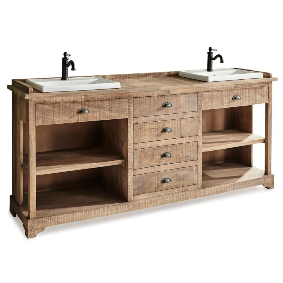 Un meuble digne d‘une maison de campagne accueillante pour votre toilette. En bois de manguier au veinage naturel, avec deux vasques en céramique haut de gamme. De nombreuses possibilités de rangement avec quatre tiroirs et des compartiments ouverts. Envie d’une ambiance empreinte de nostalgie dans votre salle de bains ? Une fois chez vous, ce meuble saura transformer toute l’atmosphère se dégageant de la pièce. De style traditionnel, il est en bois de manguier, matériau noble doté d’une structure vivante et exemplaire en matière d’écologie, puisqu’il s’agit d’un produit dérivé de la culture fruitière. Ses deux vasques en céramique haut de gamme apportent un contraste de couleurs rafraîchissant et sont très robustes et faciles d’entretien : vous adorerez ce meuble exclusif pour commencer et terminer vos journées. Les quatre tiroirs centraux et les quatre étagères ouvertes vous permettent de disposer vos objets de toilette et de décoration, tandis que les deux tiroirs sous les vasques camouflent habilement les prises de courant. Un style nostalgique souligné à merveille par d’authentiques poignées coquilles.