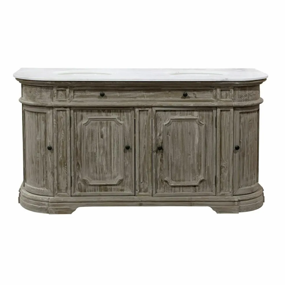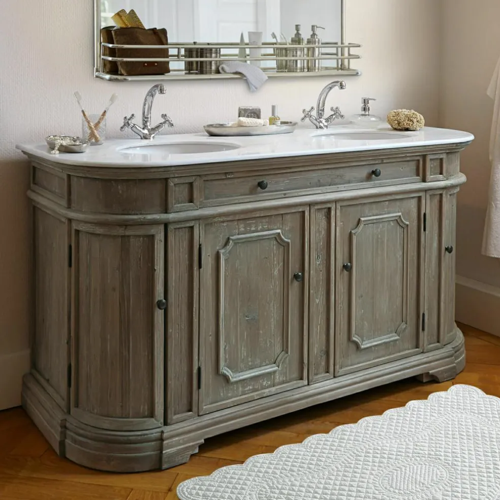 Ce plan vasque majestueux combine des matériaux naturels haut de gamme. Une magnifique plaque de pierre avec deux vasques surmonte un élégant meuble en bois de pin fabriqué à la main. Les portes arrondies sur les côtés, les éléments décoratifs raffinés complètent la noblesse à l’ancienne du modèle. Les quatre portes offrent un espace de rangement très important.