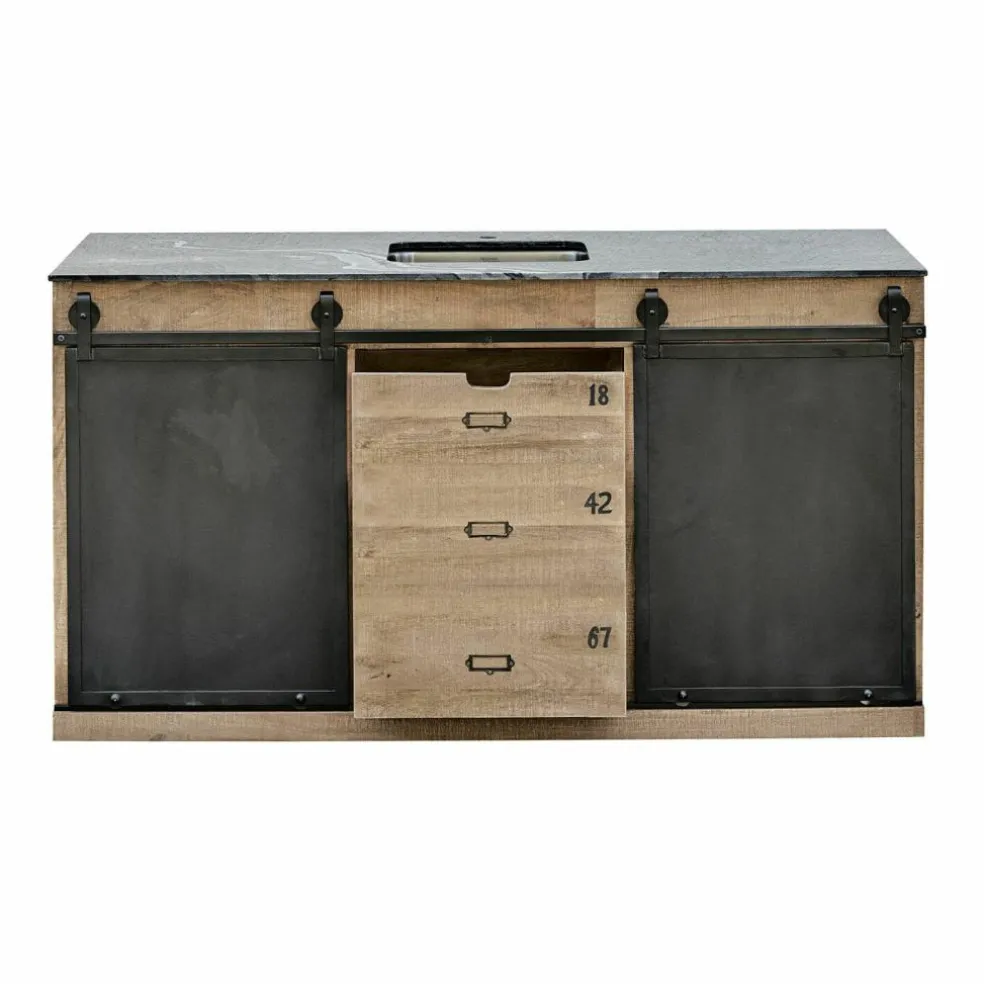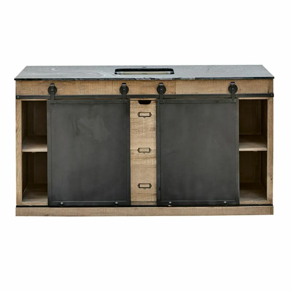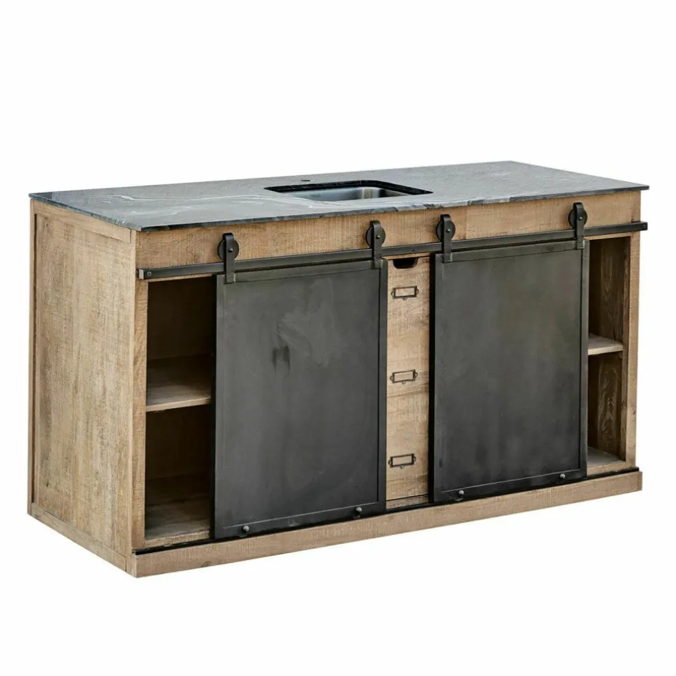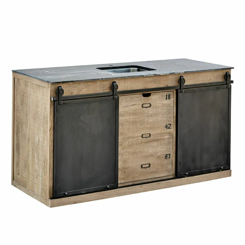 Superbe look industriel. Un plan de travail haut de gamme en pierre naturelle vient compléter le corps en bois de manguier solide à la surface brute de sciage. Compartiments spacieux derrière les portes coulissantes en fer. Vous est-il déjà arrivé de compter combien de fois par jour vous utilisez l’évier de la cuisine ? Vous y prélevez l’eau pour le café et les pâtes, vous y lavez votre salade et autres légumes, vous y faites au moins une partie de votre vaisselle puisque toutes les poêles et casseroles ne passent pas au lave-vaisselle. C’est pourquoi ce meuble devrait être particulièrement qualitatif et durable, des qualités regroupées dans l’article présenté ici. Le corps du meuble, soigneusement fabriqué à la main, est en manguier massif, un bois particulièrement solide et durable dans le temps. Et comme il s’agit ici d’un sous-produit d’une culture fruitière, il s’inscrit également dans une logique de durabilité. La surface brute de sciage à l’aspect rustique flatte irrésistiblement le regard et s’harmonise parfaitement avec les deux portes coulissantes en fer massif qui s’ouvrent sur deux compartiments spacieux. Et comme le plateau haut de gamme en pierre naturelle de chaque modèle affiche un veinage individuel, il fait de votre meuble une pièce unique. Ce modèle de grande qualité est complété par un évier intégré en inox.
