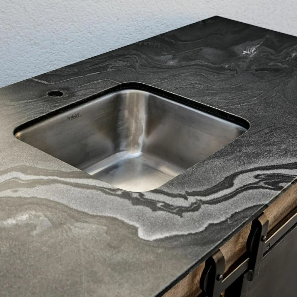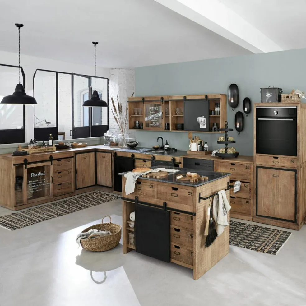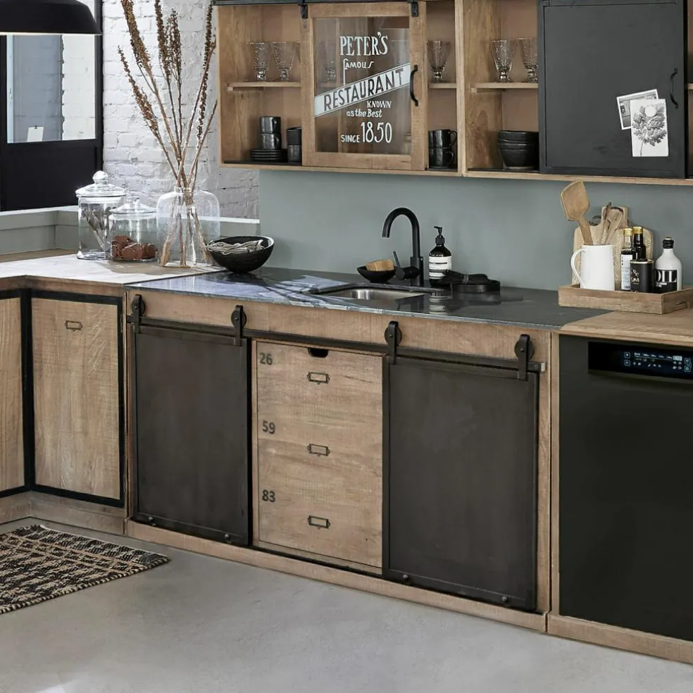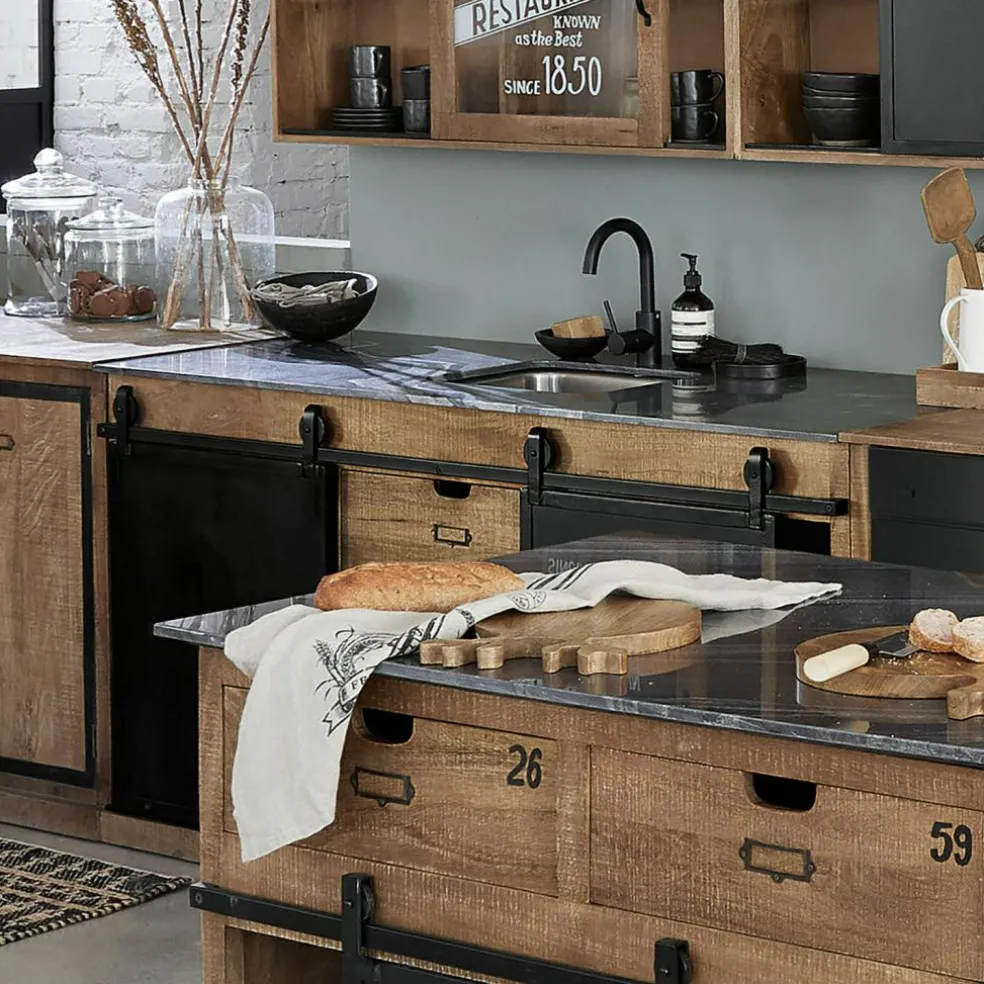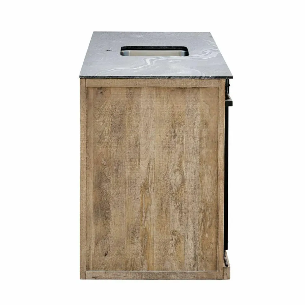 Superbe look industriel. Un plan de travail haut de gamme en pierre naturelle vient compléter le corps en bois de manguier solide à la surface brute de sciage. Compartiments spacieux derrière les portes coulissantes en fer. Vous est-il déjà arrivé de compter combien de fois par jour vous utilisez l’évier de la cuisine ? Vous y prélevez l’eau pour le café et les pâtes, vous y lavez votre salade et autres légumes, vous y faites au moins une partie de votre vaisselle puisque toutes les poêles et casseroles ne passent pas au lave-vaisselle. C’est pourquoi ce meuble devrait être particulièrement qualitatif et durable, des qualités regroupées dans l’article présenté ici. Le corps du meuble, soigneusement fabriqué à la main, est en manguier massif, un bois particulièrement solide et durable dans le temps. Et comme il s’agit ici d’un sous-produit d’une culture fruitière, il s’inscrit également dans une logique de durabilité. La surface brute de sciage à l’aspect rustique flatte irrésistiblement le regard et s’harmonise parfaitement avec les deux portes coulissantes en fer massif qui s’ouvrent sur deux compartiments spacieux. Et comme le plateau haut de gamme en pierre naturelle de chaque modèle affiche un veinage individuel, il fait de votre meuble une pièce unique. Ce modèle de grande qualité est complété par un évier intégré en inox.